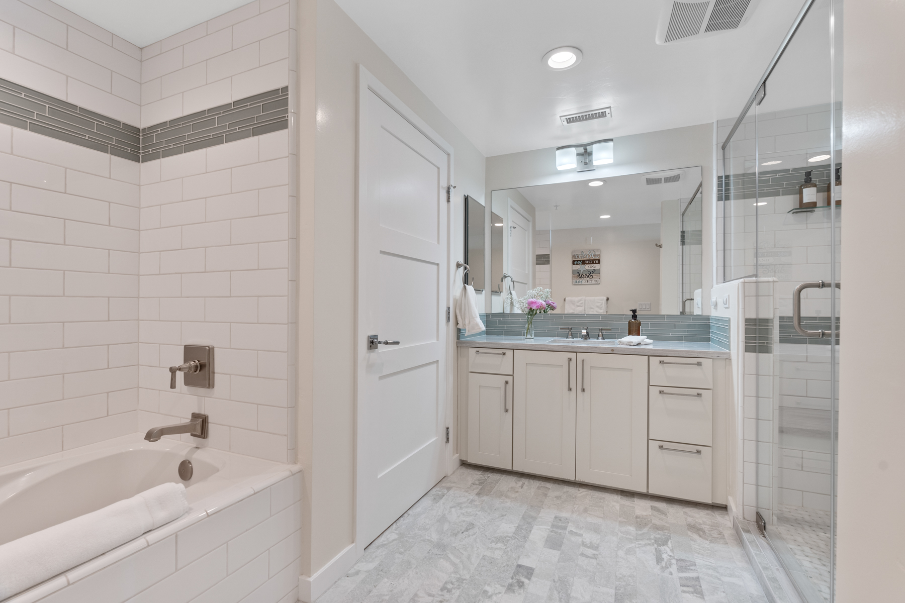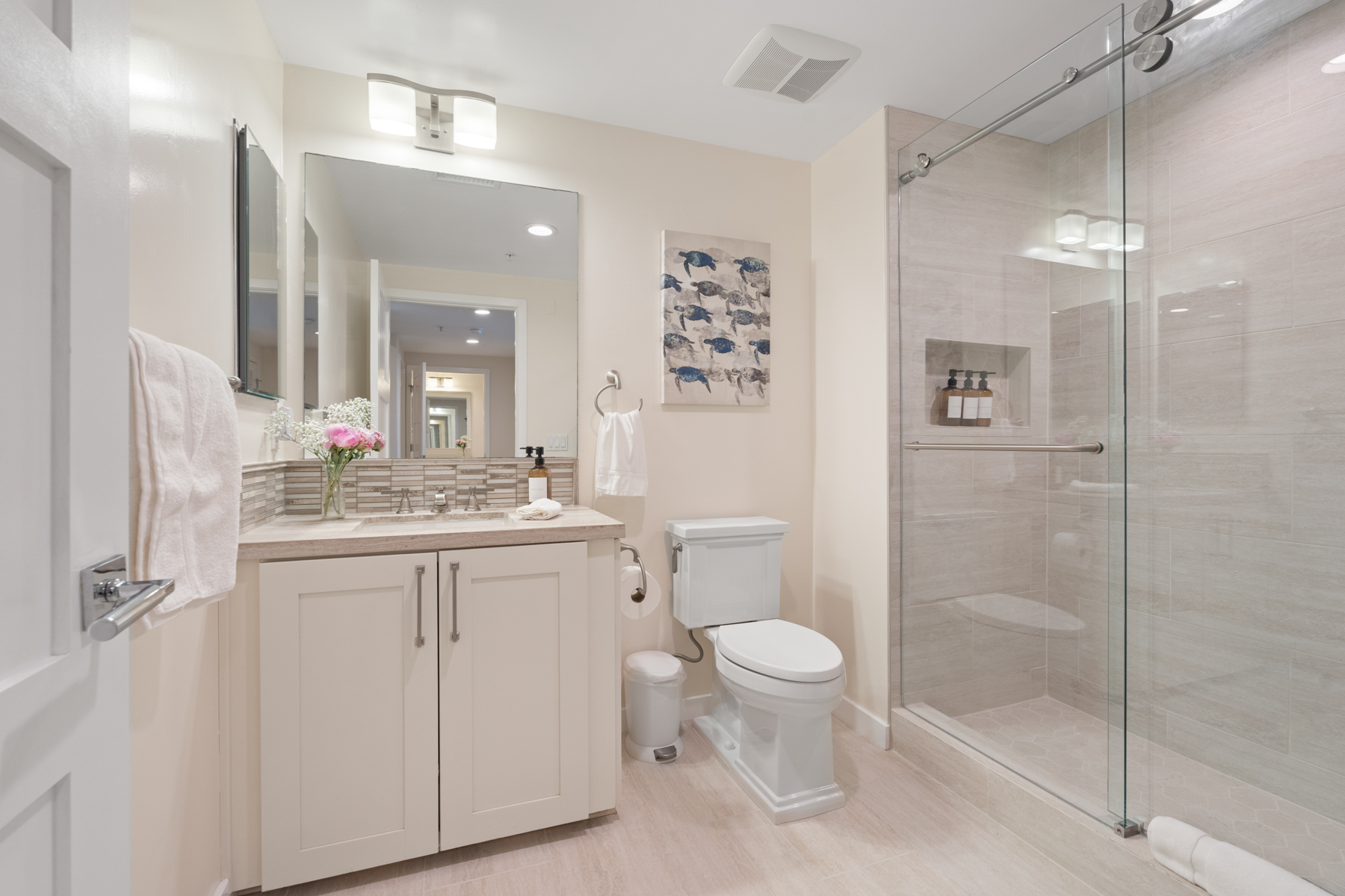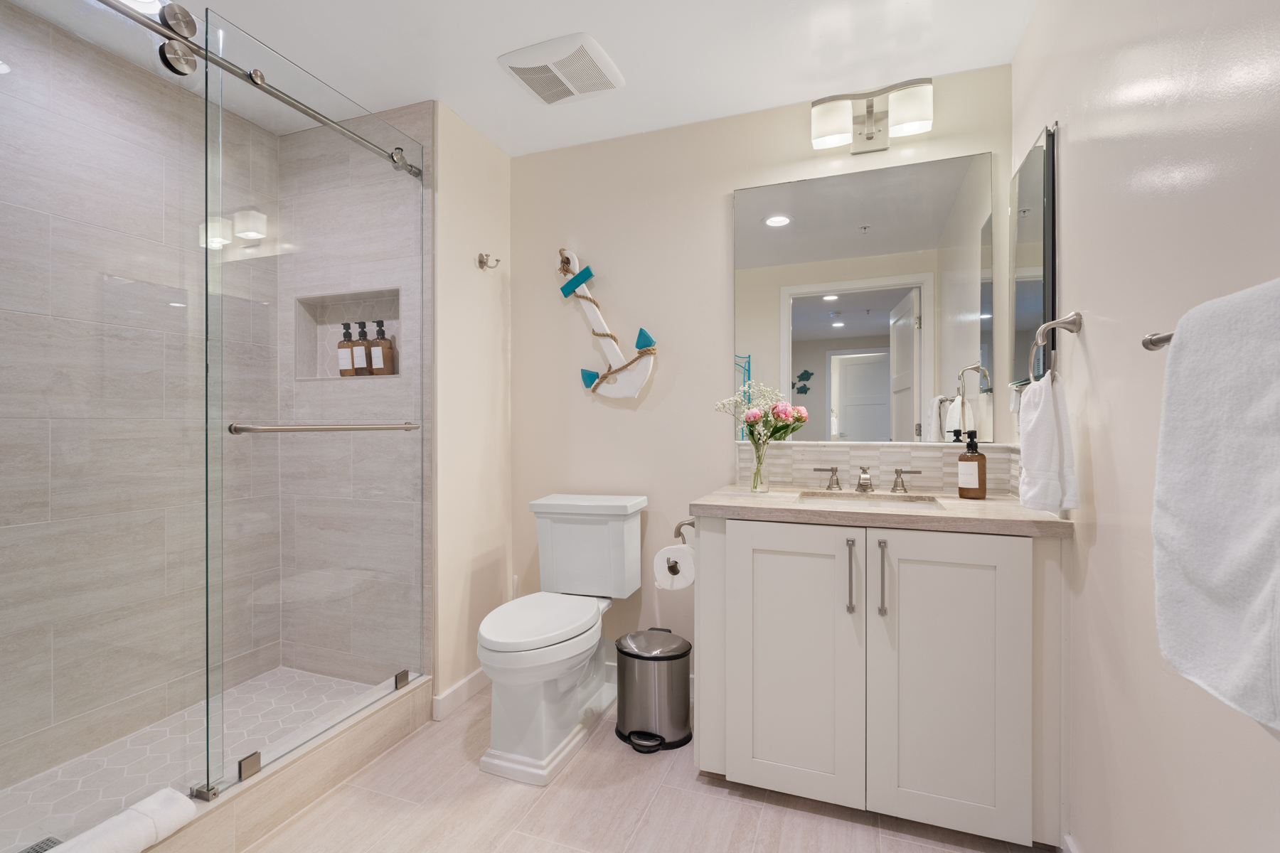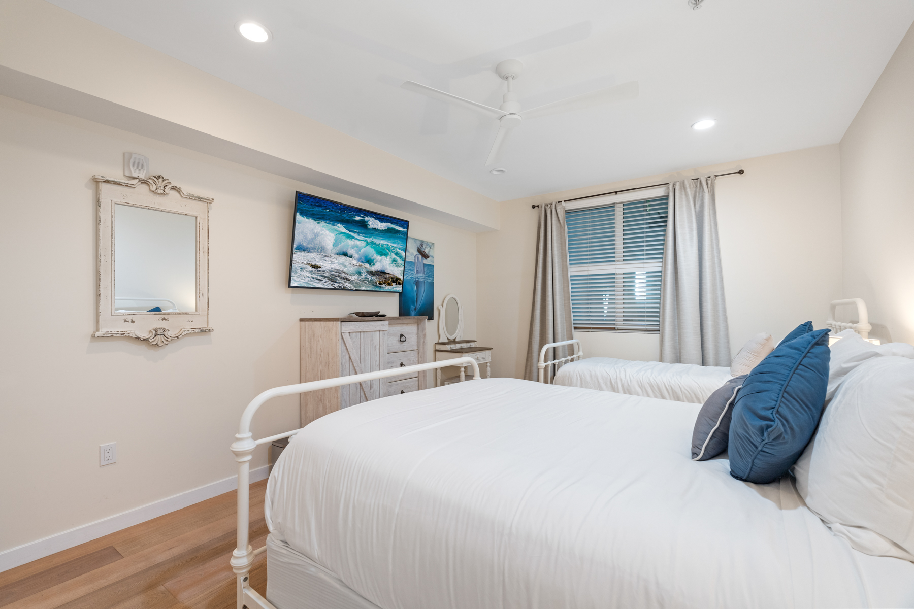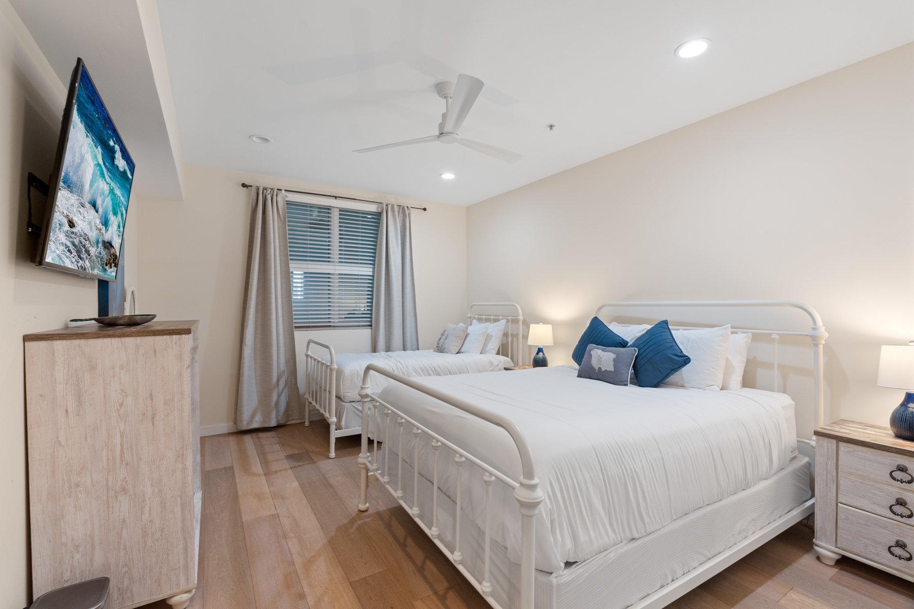 The ocean view primary suite is next to the living room. It opens up to a furnished terrace and has a TV and a full en suite bath with a shower/tub combination. There are two guest bedrooms in the front of this home – one has a Cal-King bed, a TV, and access to an adjacent fully remodeled bathroom with shower (photos in November). The other bedroom has a queen bed plus a twin bed, a TV, and access to another adjacent fully remodeled bathroom with shower (photos in November). Both of the guest bathrooms have been recently updated with new showers and flooring.