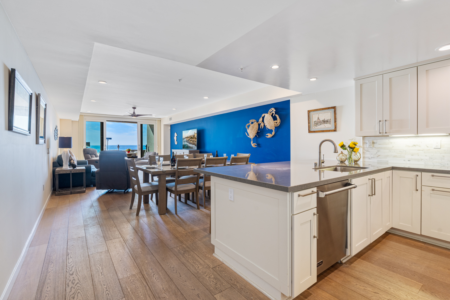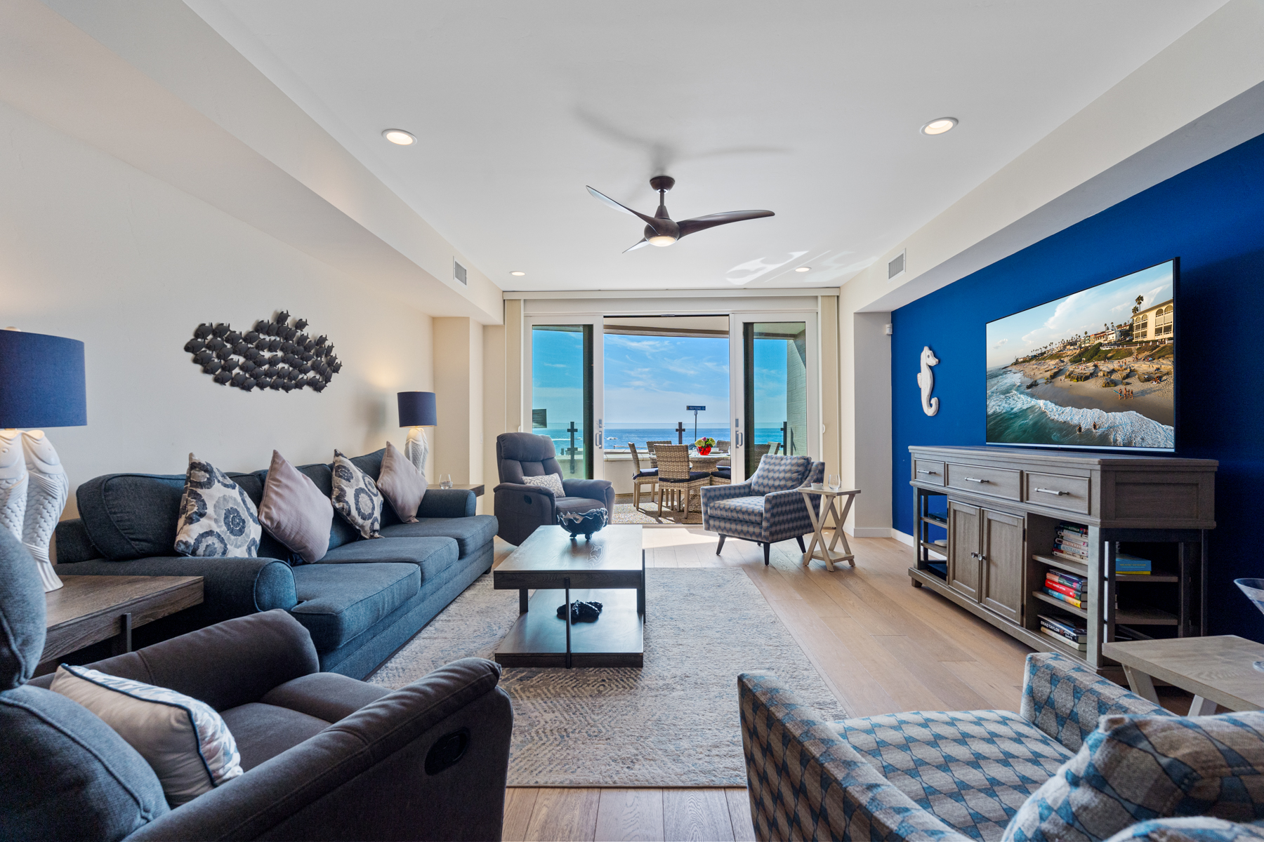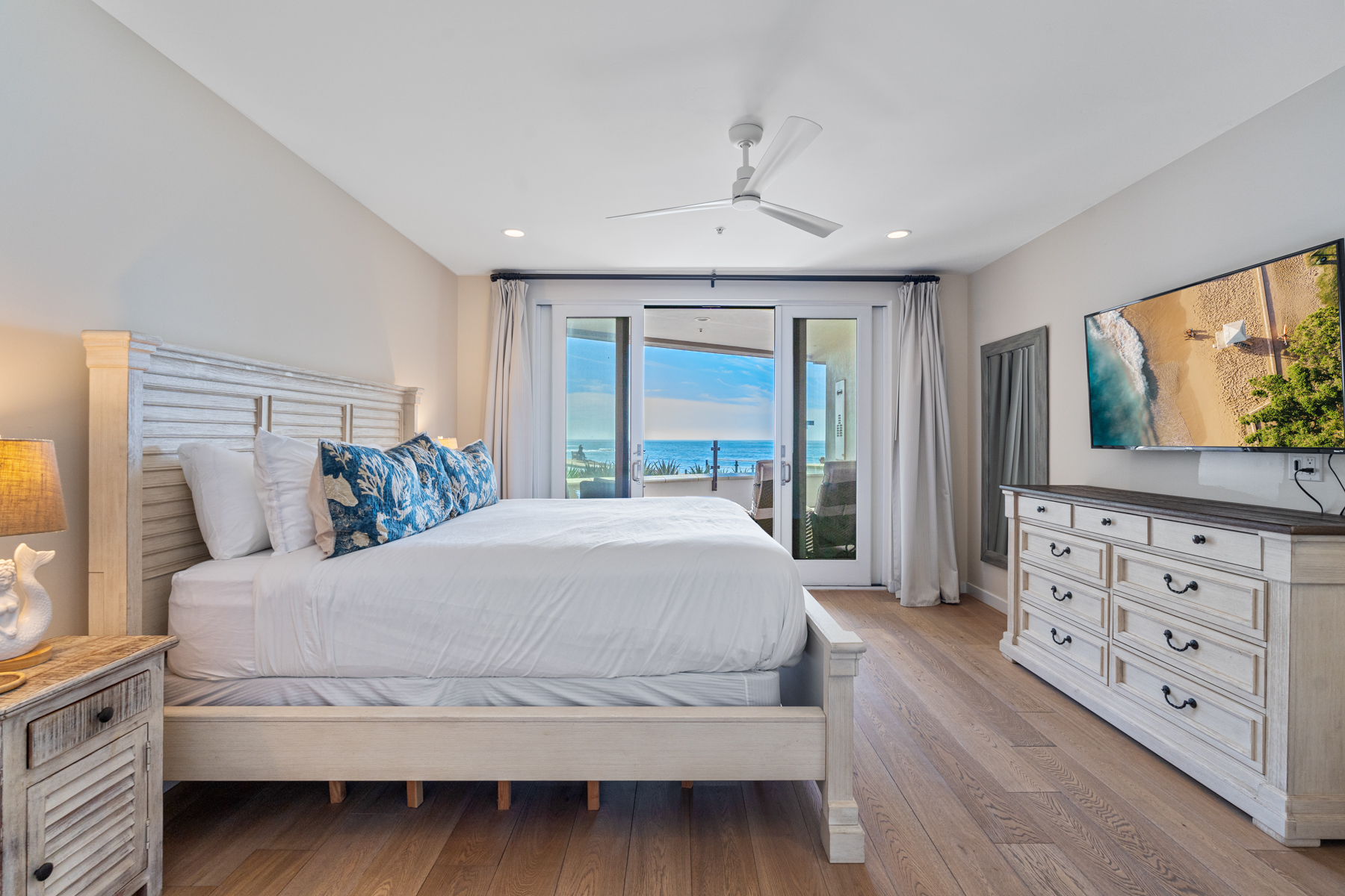 Enjoy sweeping ocean views from its waterfront terrace, the main bedroom, and the living room allow you to go to sleep and wake up to soothing ocean breezes and the ever-changing sounds of the surf. The terrace creates a beautiful space for indoor/outdoor living with its table and chairs for dining al fresco and comfortable lounge furniture. Tasteful beach décor throughout makes this seaside getaway a perfect place for relaxing, connecting, and recharging - starting with its large, spacious living room with slider access to the oceanfront patio, lots of comfortable seating, and its large TV. Cook and enjoy being together in the large well-equipped kitchen with a breakfast bar with high-top stools and a seamless flow to the living room and ocean view terrace. A comfortable, well-appointed dining room that seats everyone rounds out this spacious great room.