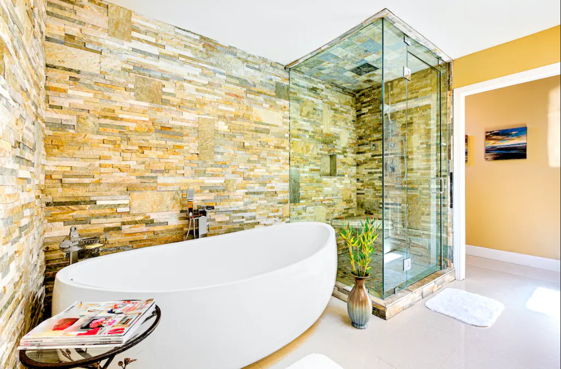 The spa-like bathroom is a retreat unto itself. Relax in the tropical rain shower. The focal point of the master bathroom is a modern oval freestanding 72'' soaking tub.