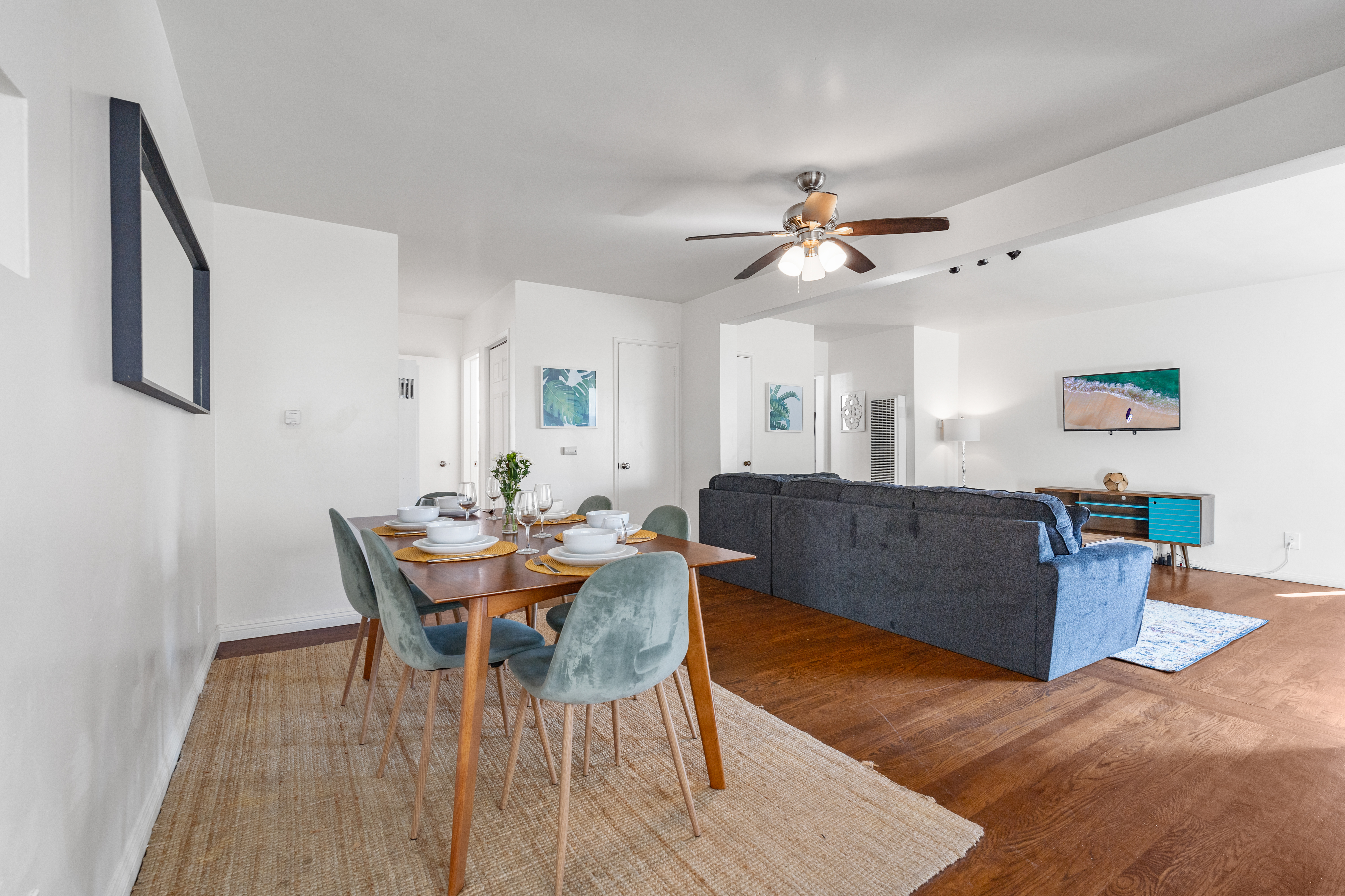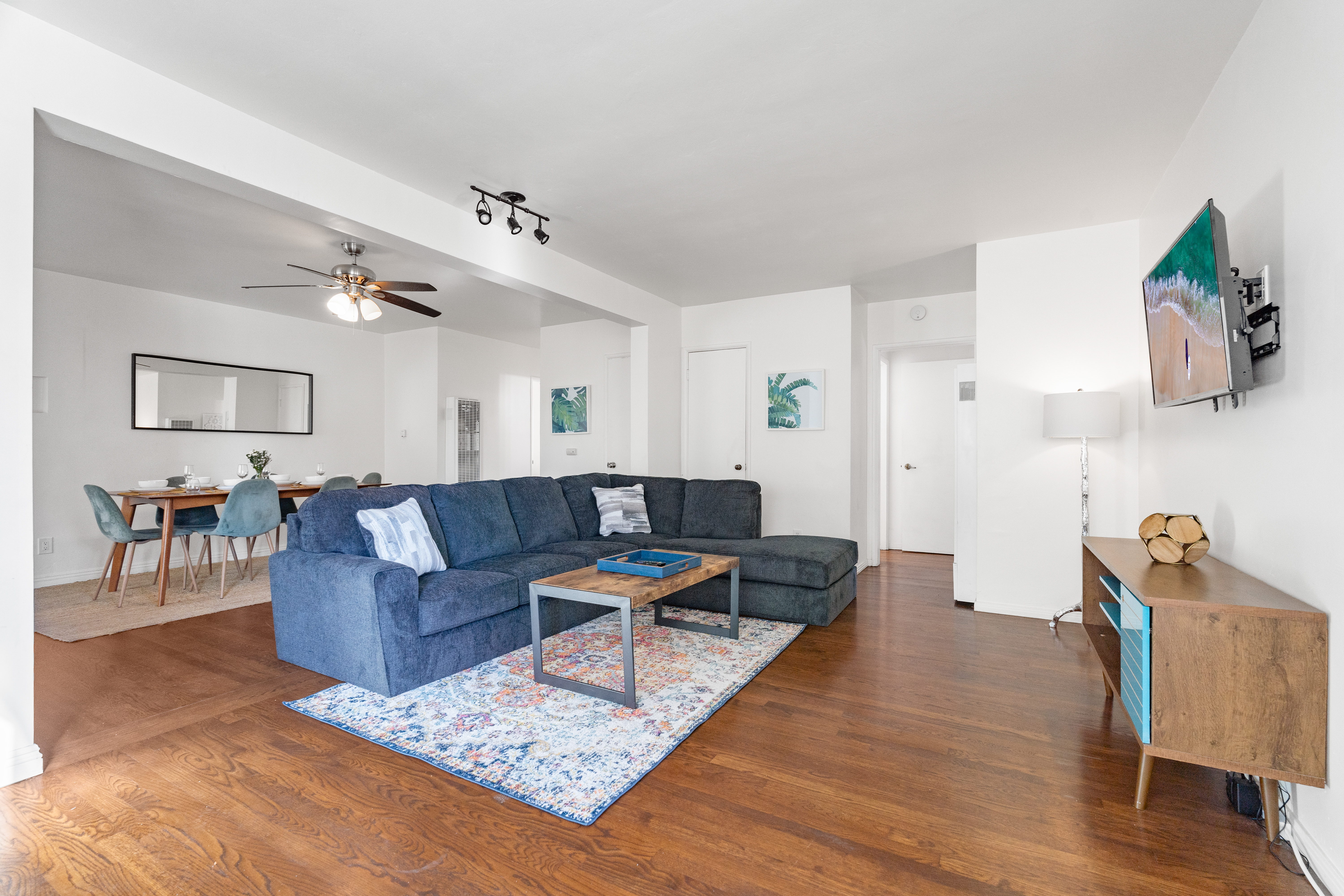 An expansive great room welcomes you with a living room area that has a large comfortable sectional couch, a large flat screen TV for your enjoyment, and a ceiling fan to keep your comfortable day and night.
