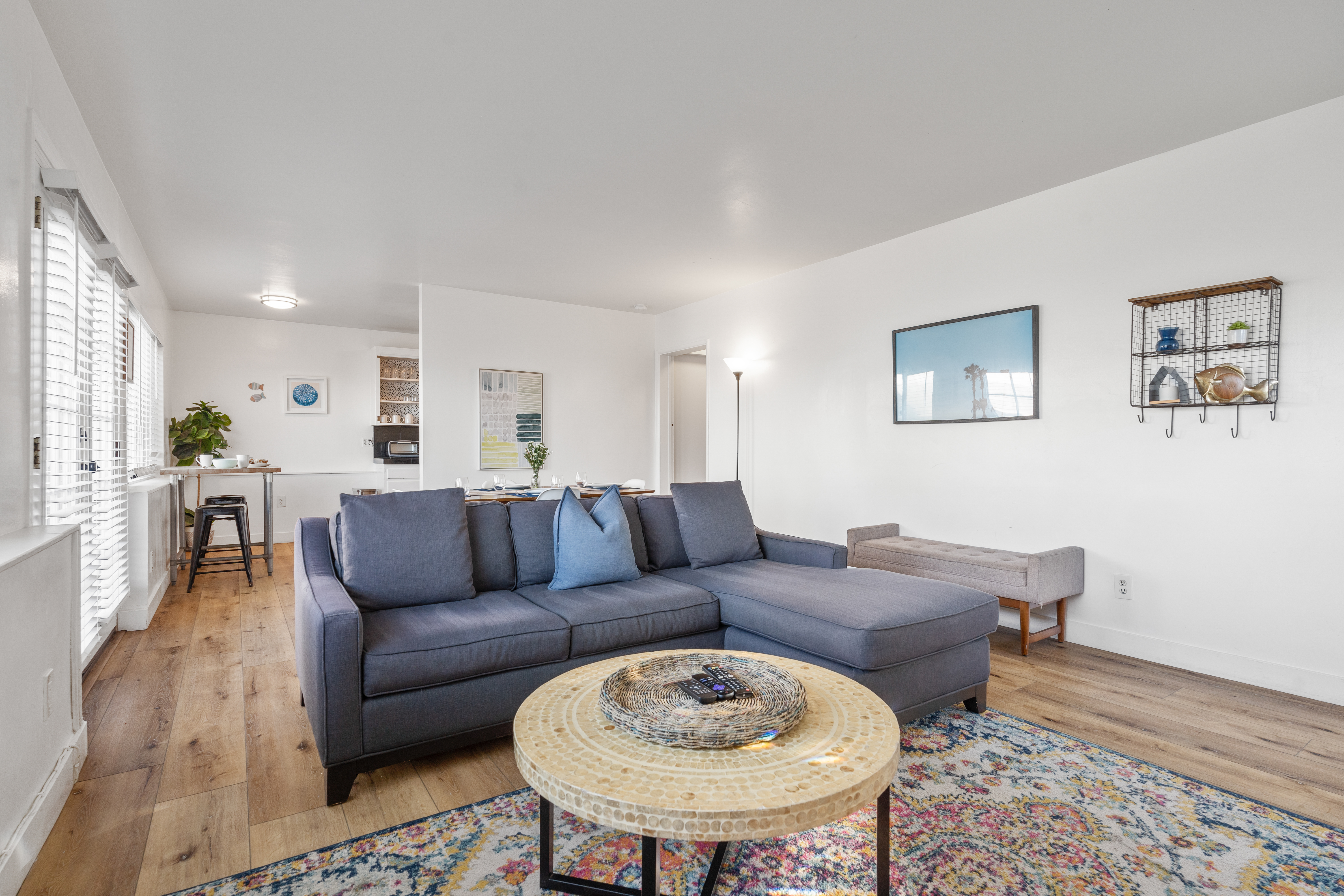 The dining/living area has ocean views and welcomes. Just turn your head slightly while watching TV and you can take in an ocean view with palm trees waving in front of it. Fun.
