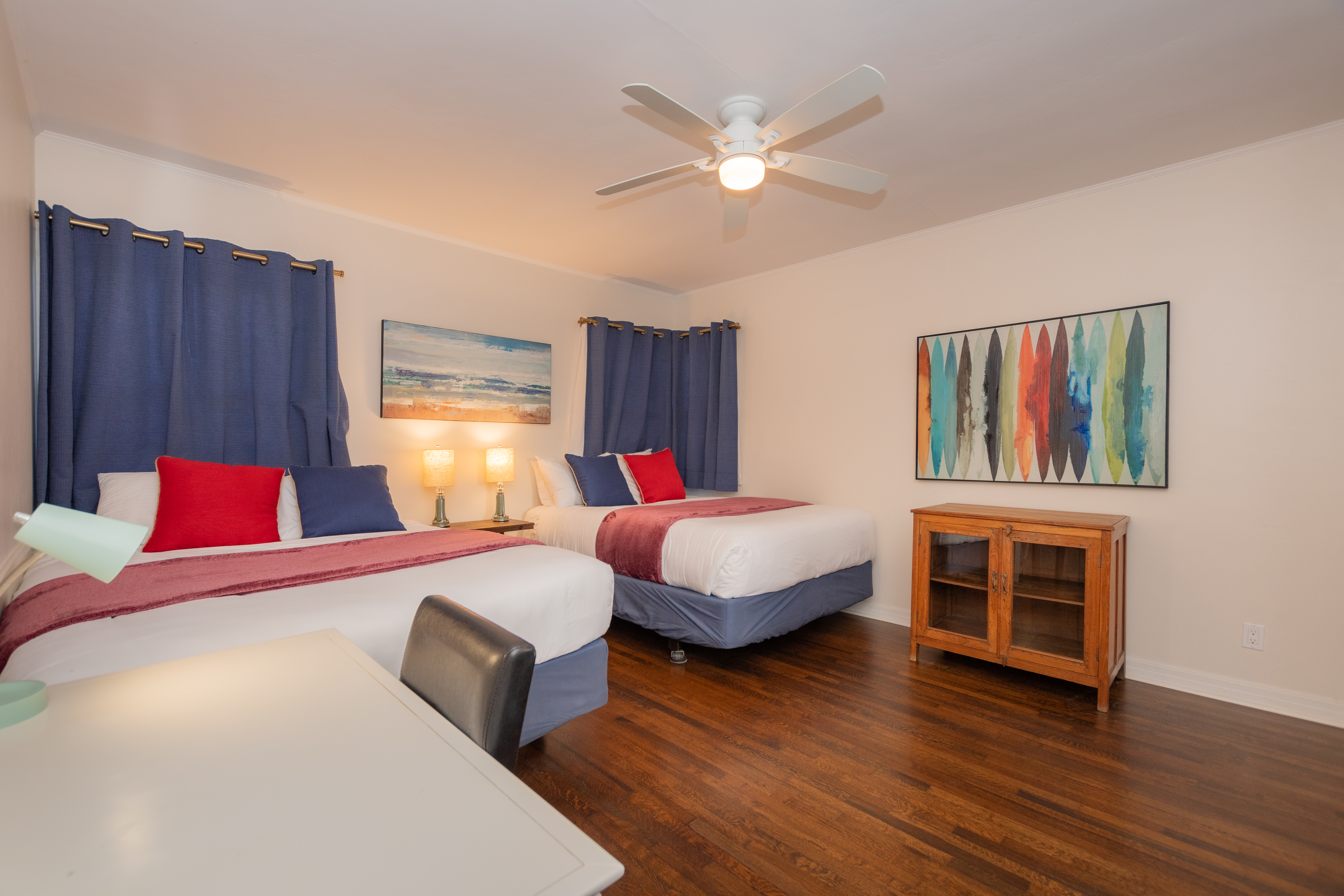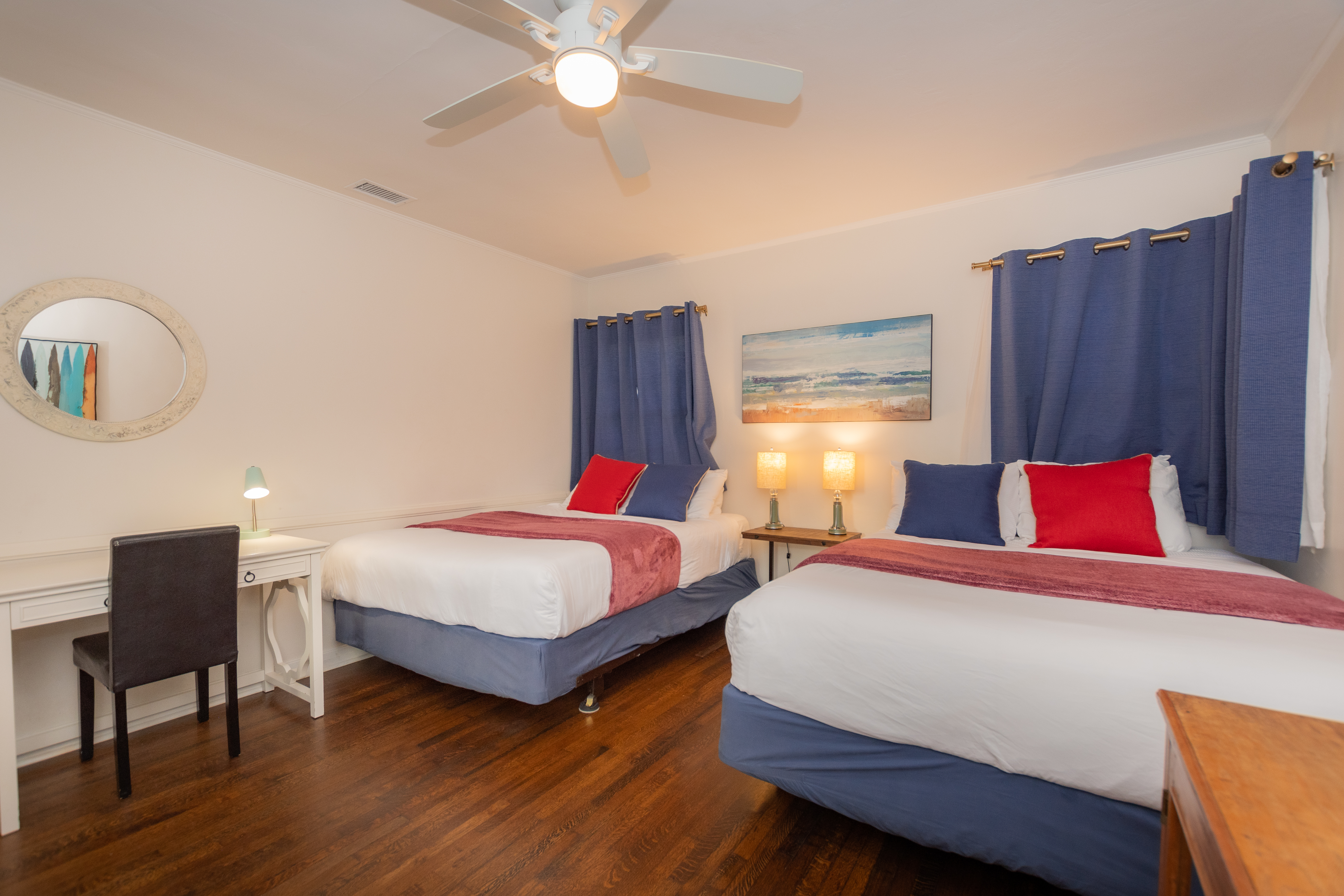 The second bedroom also features a king-sized bed, flat screen TV, and ceiling fan. The third bedroom has 2 queen-sized beds, great for the children. This room also has a desk for remote work or learning. The shared hallway bathroom has a tub, shower, and a dual sink vanity.