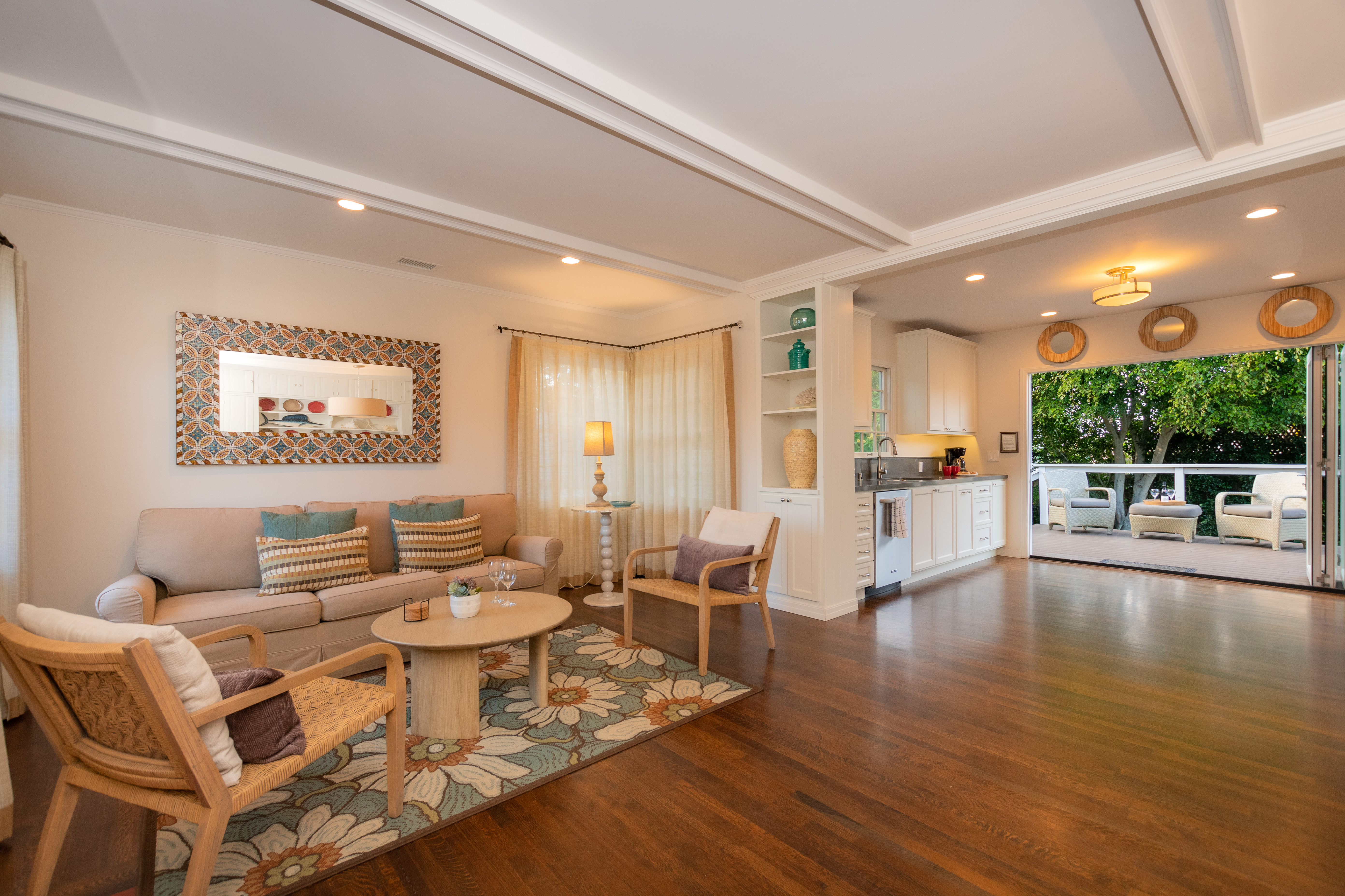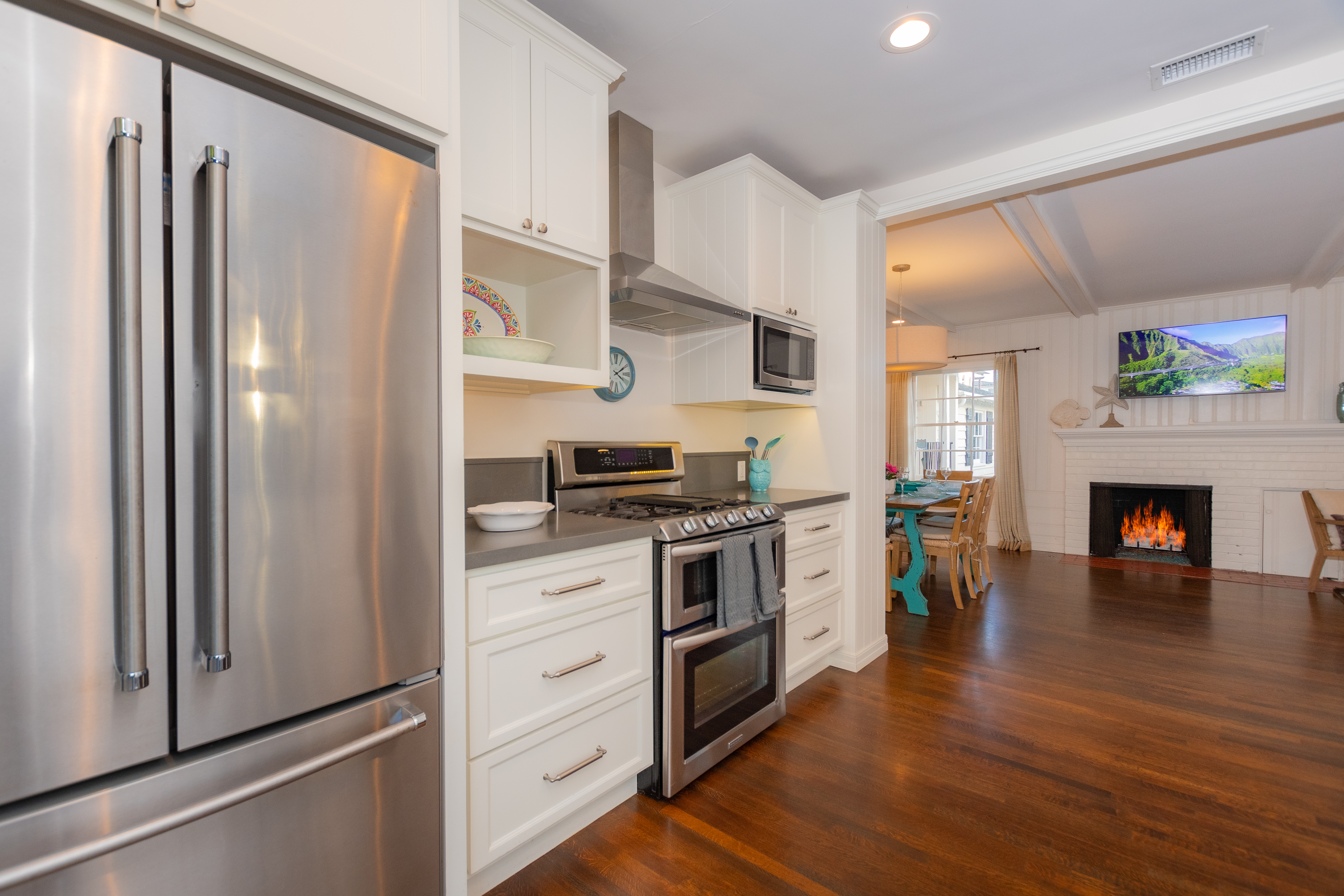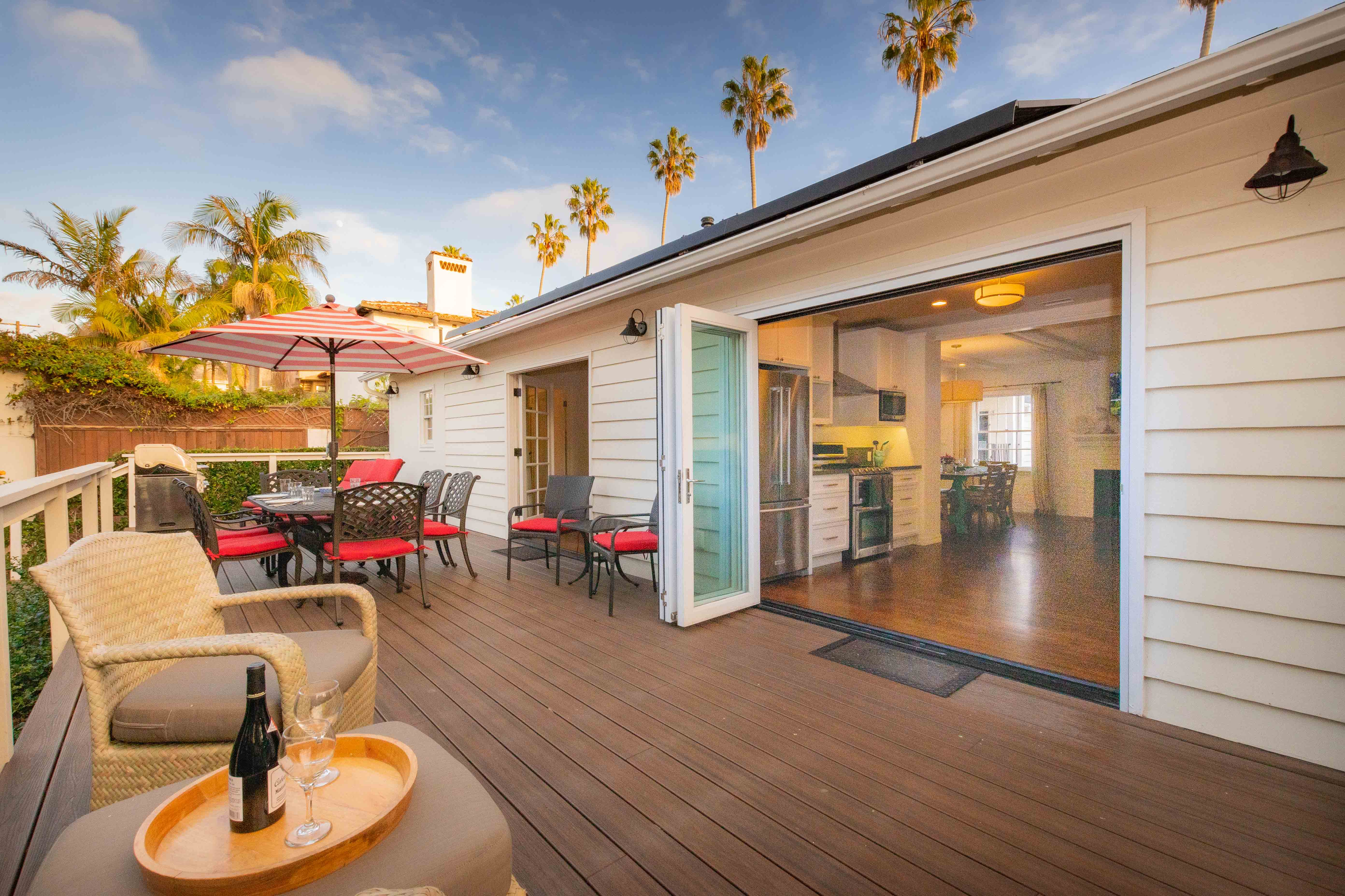 The living room and dining room combination is open to the kitchen to make this home feel airy and spacious. The living room features a large flat screen TV, gas fireplace and comfy furnishings in a fun and casual coastal décor. The dining area has a generous sized table with seating for 8 people. Hardwood floors throughout the home, beamed ceilings and classic California design accents. The spacious kitchen is newly equipped with all new, top of the line appliances and gas range. The kitchen doors fold back opening up the entire wall to create seamless indoor/outdoor living. An outside dining space for 8 people, lounge chairs and a seating area make for afternoon family BBQ's and just lounging in the shady backyard.