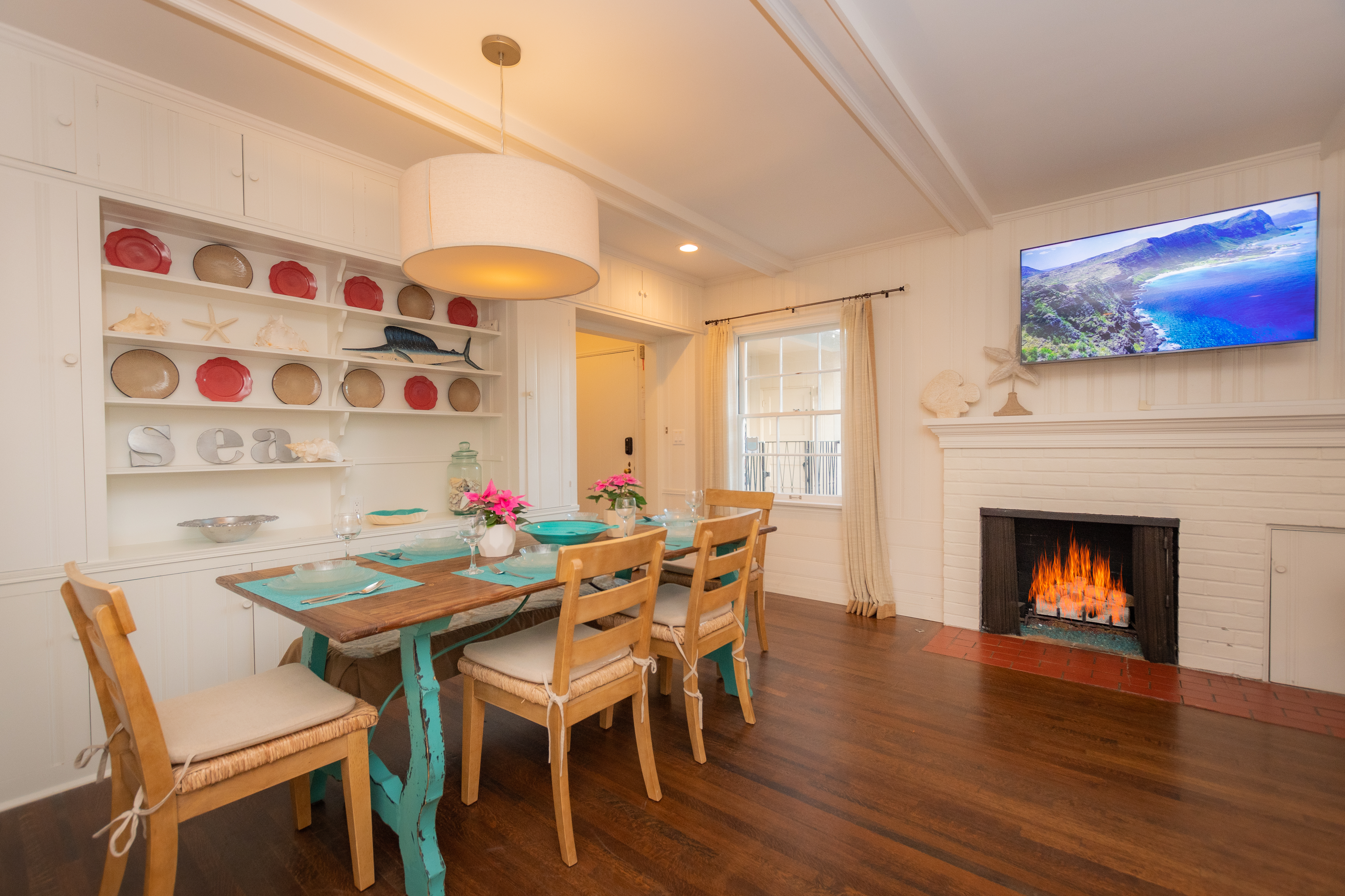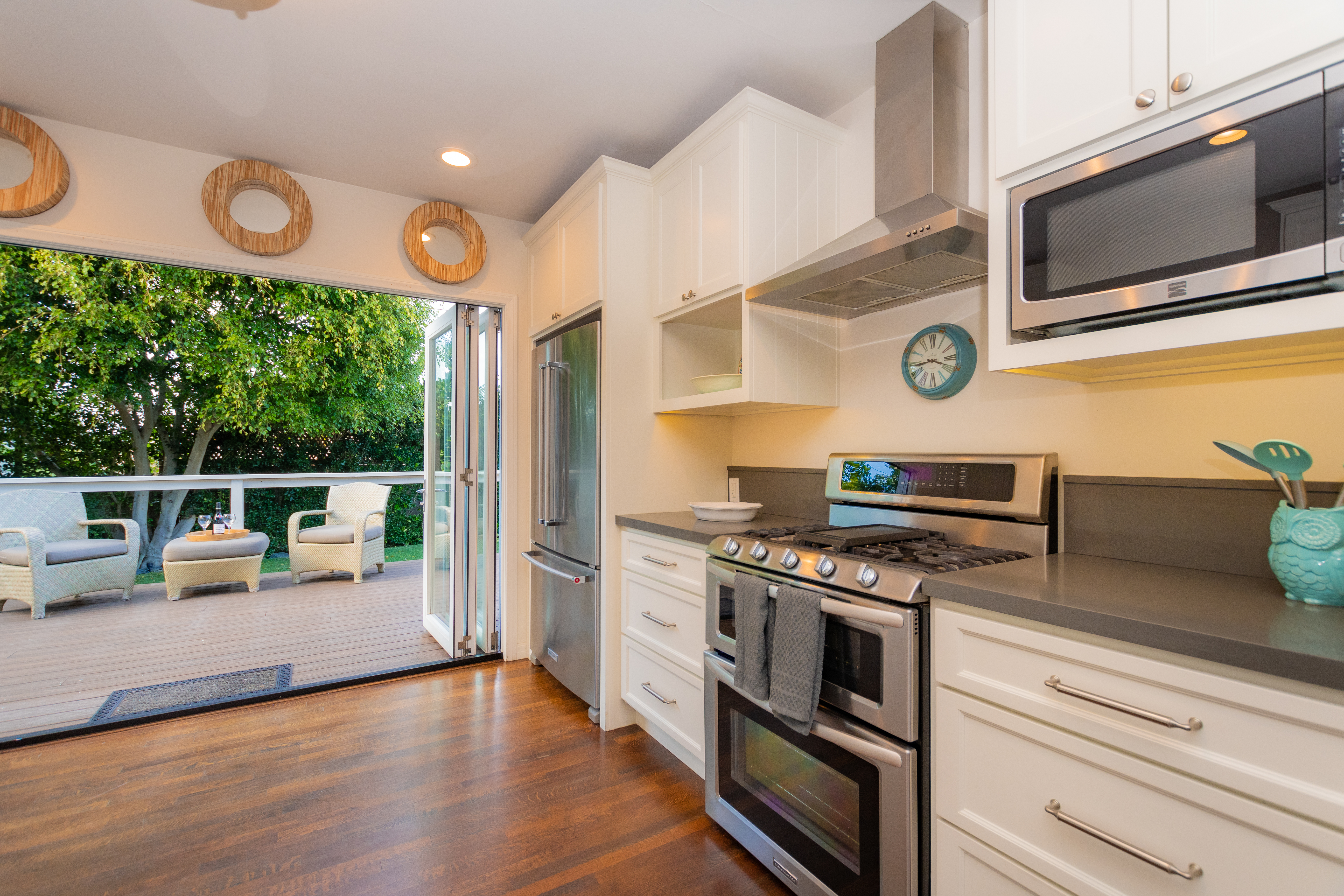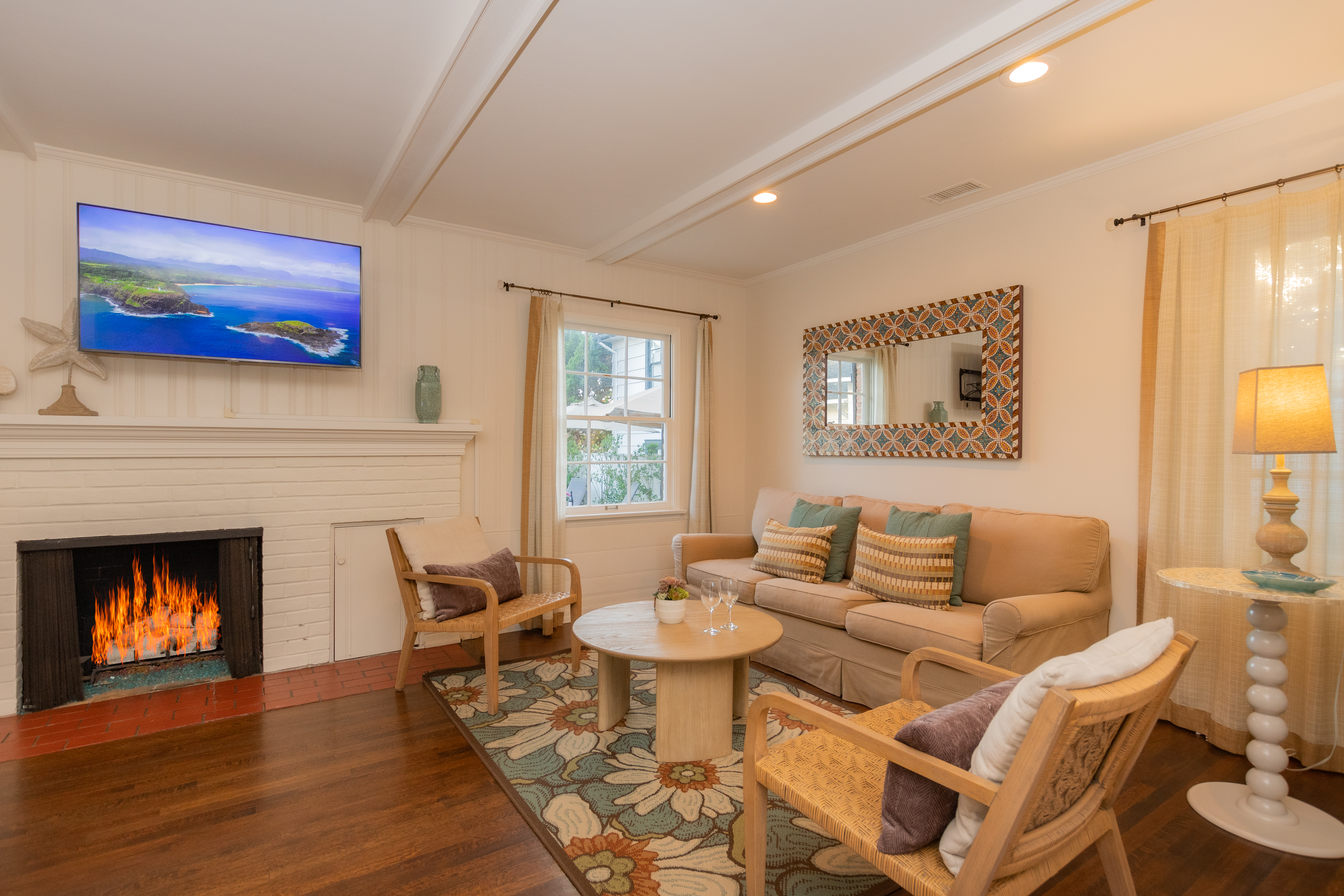 The living room and dining room combination is open to the kitchen to make this home feel airy and spacious. The living room features a large flat screen TV, gas fireplace and comfy furnishings in a fun and casual coastal décor. The dining area has a generous sized table with seating for 8 people. Hardwood floors throughout the home, beamed ceilings and classic California design accents. The spacious kitchen is newly equipped with all new, top of the line appliances and gas range. The kitchen doors fold back opening up the entire wall to create seamless indoor/outdoor living. An outside dining space for 8 people, lounge chairs and a seating area make for afternoon family BBQ's and just lounging in the shady backyard.
