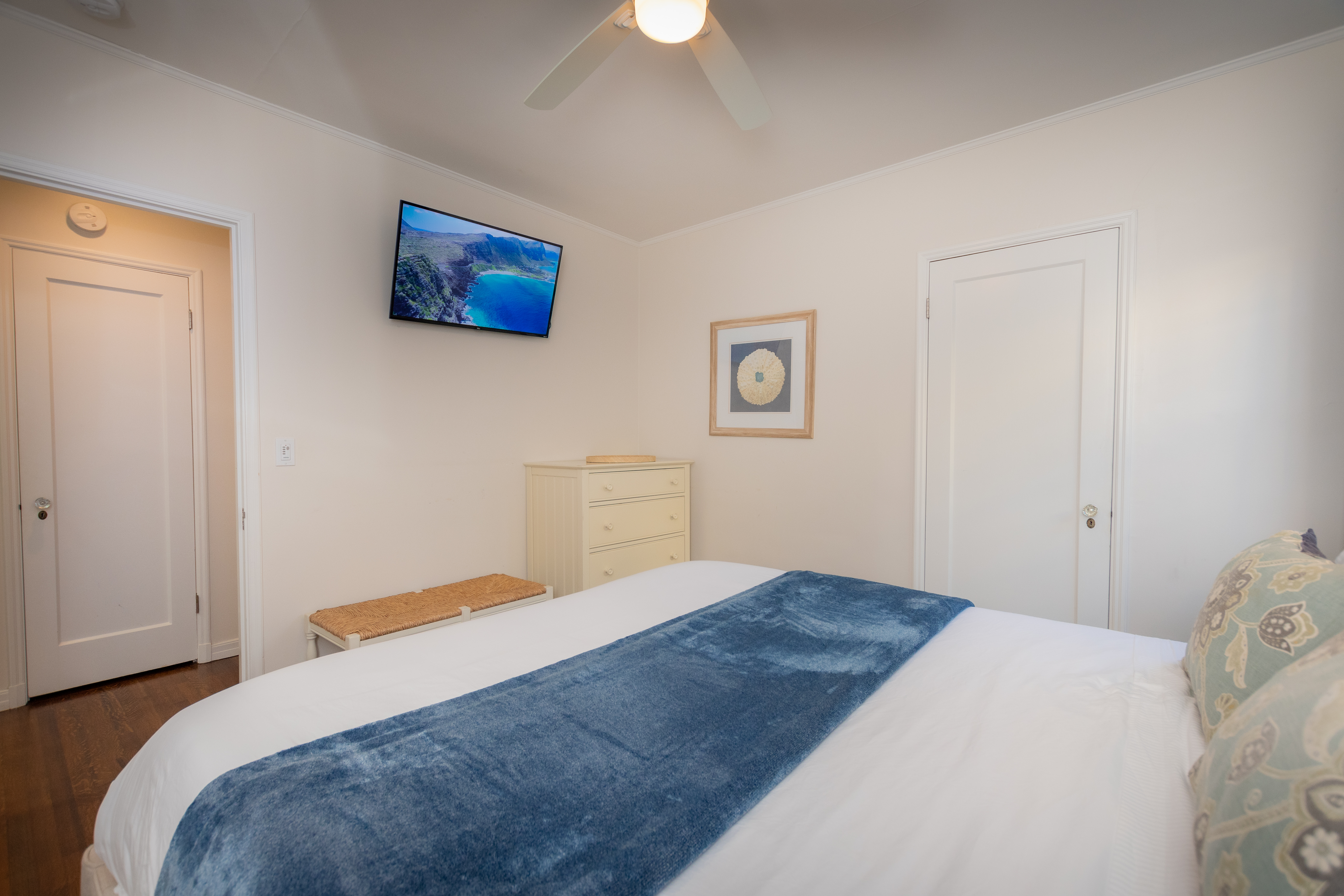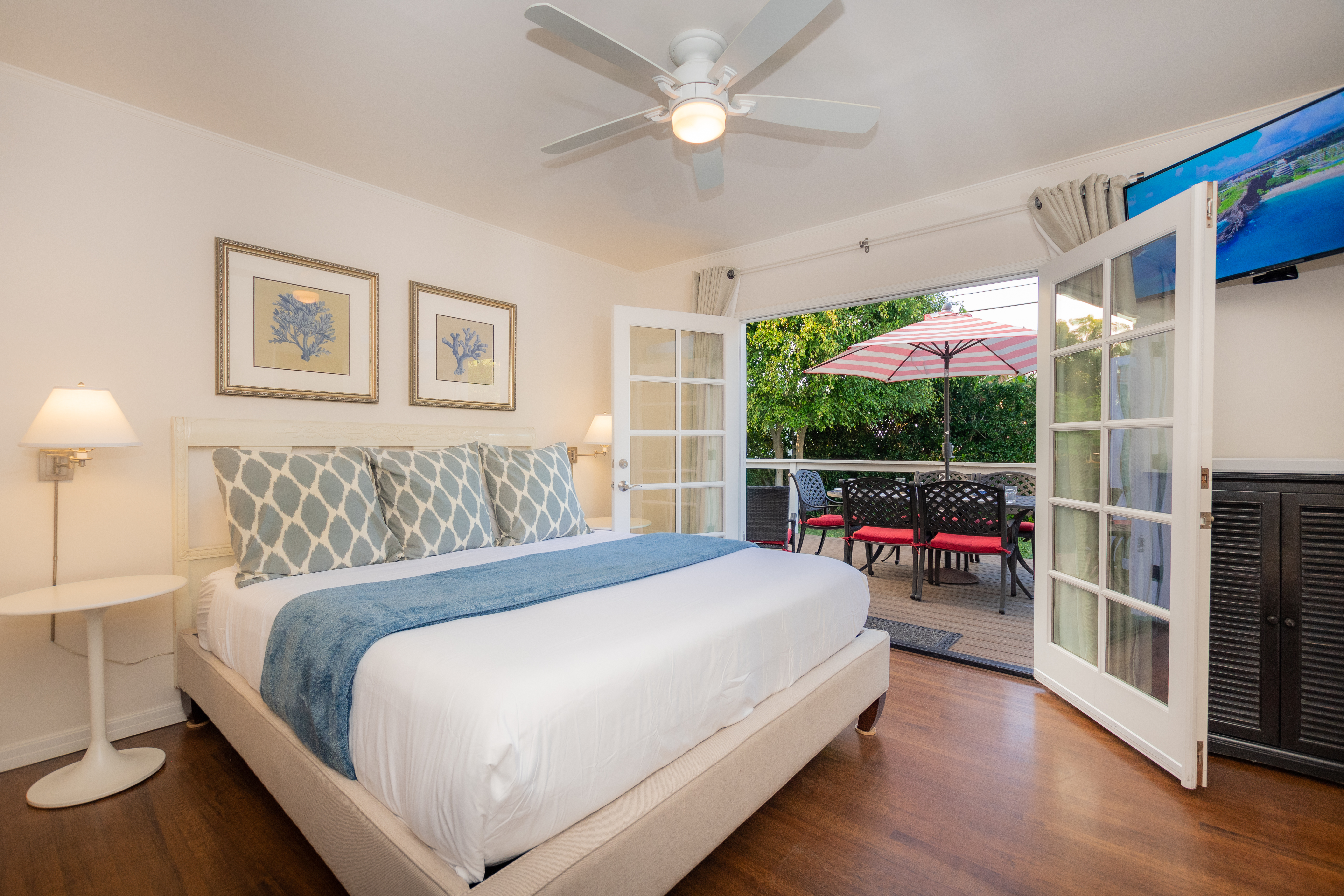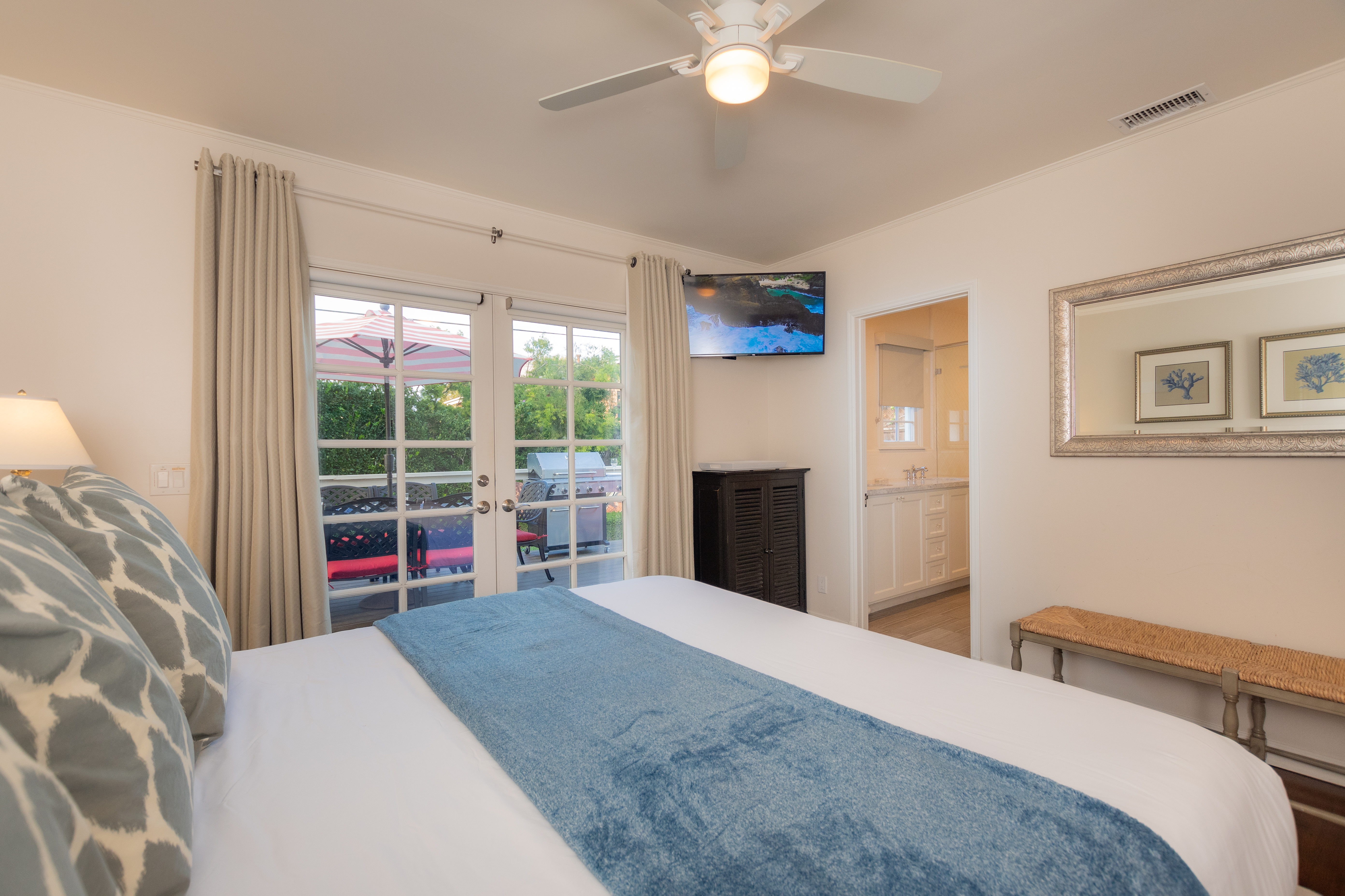The private master bedroom is located in the back of the home with French doors that open onto the deck and lush garden views. Enjoy the California king sized bed, premium bedding, flat screen TV, ceiling fan, and generous closet space in this peaceful room. The private bath has a dual sink vanity and a walk-in shower stall with bench seating and a rain shower head.