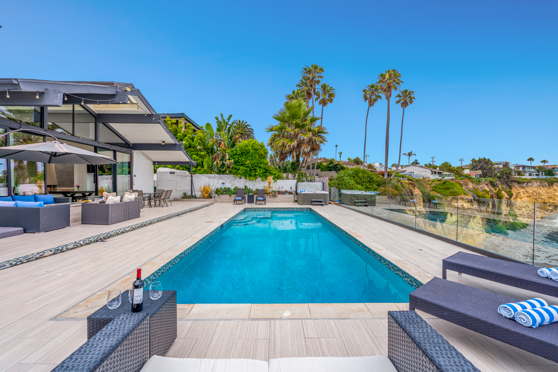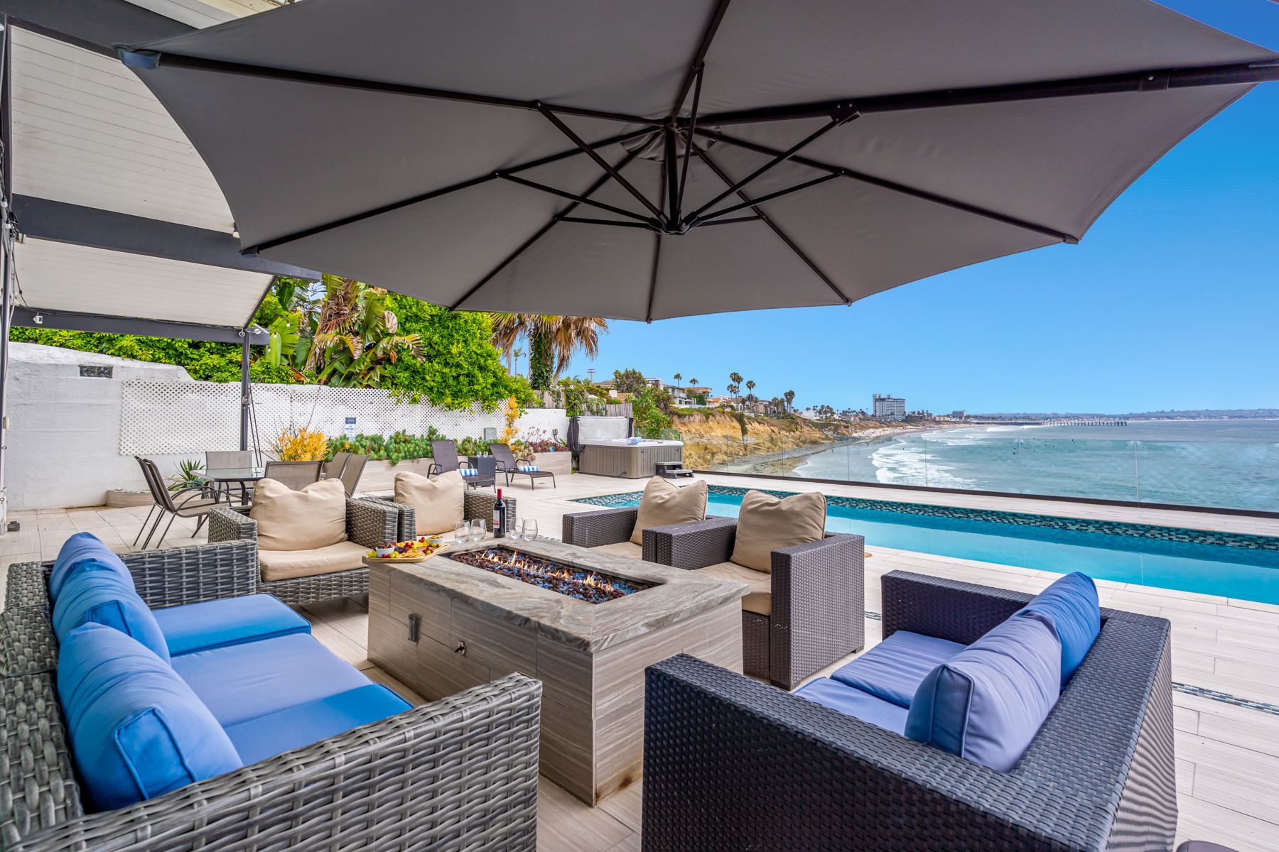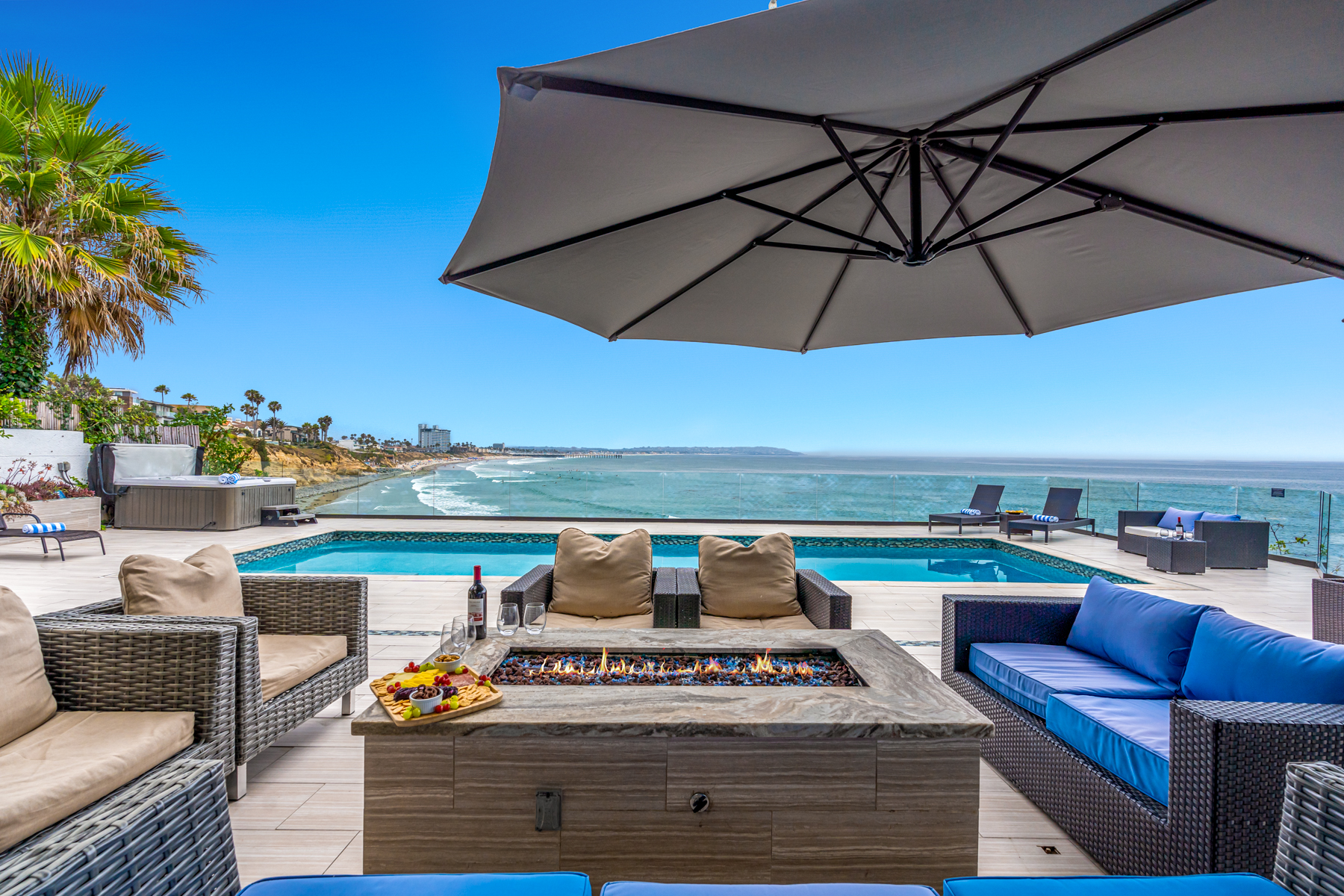 Offering 5-star service and panoramic views of the gorgeous Pacific Ocean, a private oceanfront pool and hot tub, and outdoor living at its finest, this home is sure to have you never wanting to leave. Whether you have a large family, group of friends, or multiple families vacationing together, this house can be the perfect fit. The showstopper in this home is the outside living area. You see the magnificent blue ocean no matter where you turn in the backyard. Lounge seating around the pool is perfect for enjoying the San Diego sun. As the sun goes down, you can watch the surfers at the surf break right off the cliff. A BBQ and outdoor dining furniture help make this backyard the epitome of southern California outdoor living! An additional full bathroom is outdoors by the pool for added convenience.