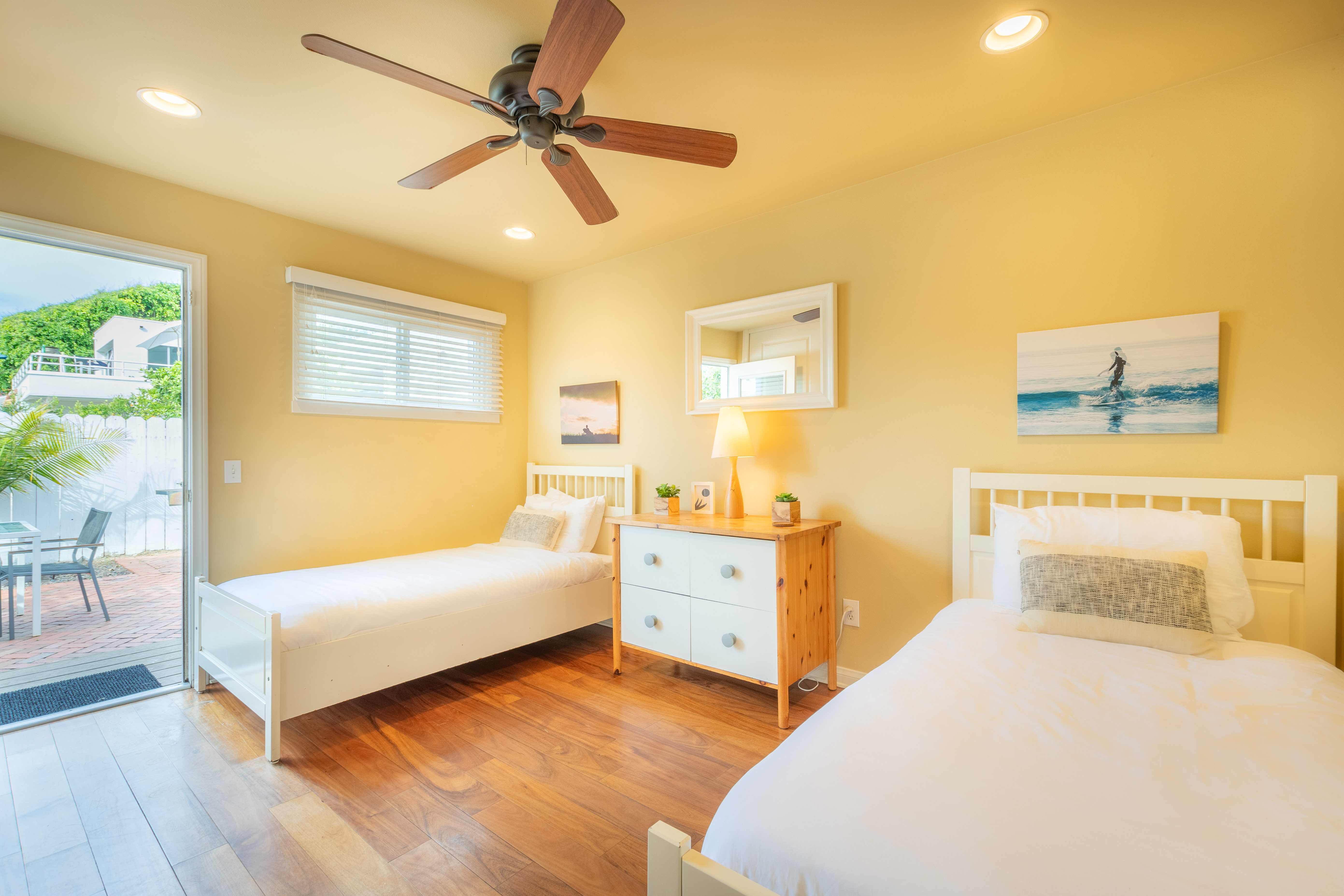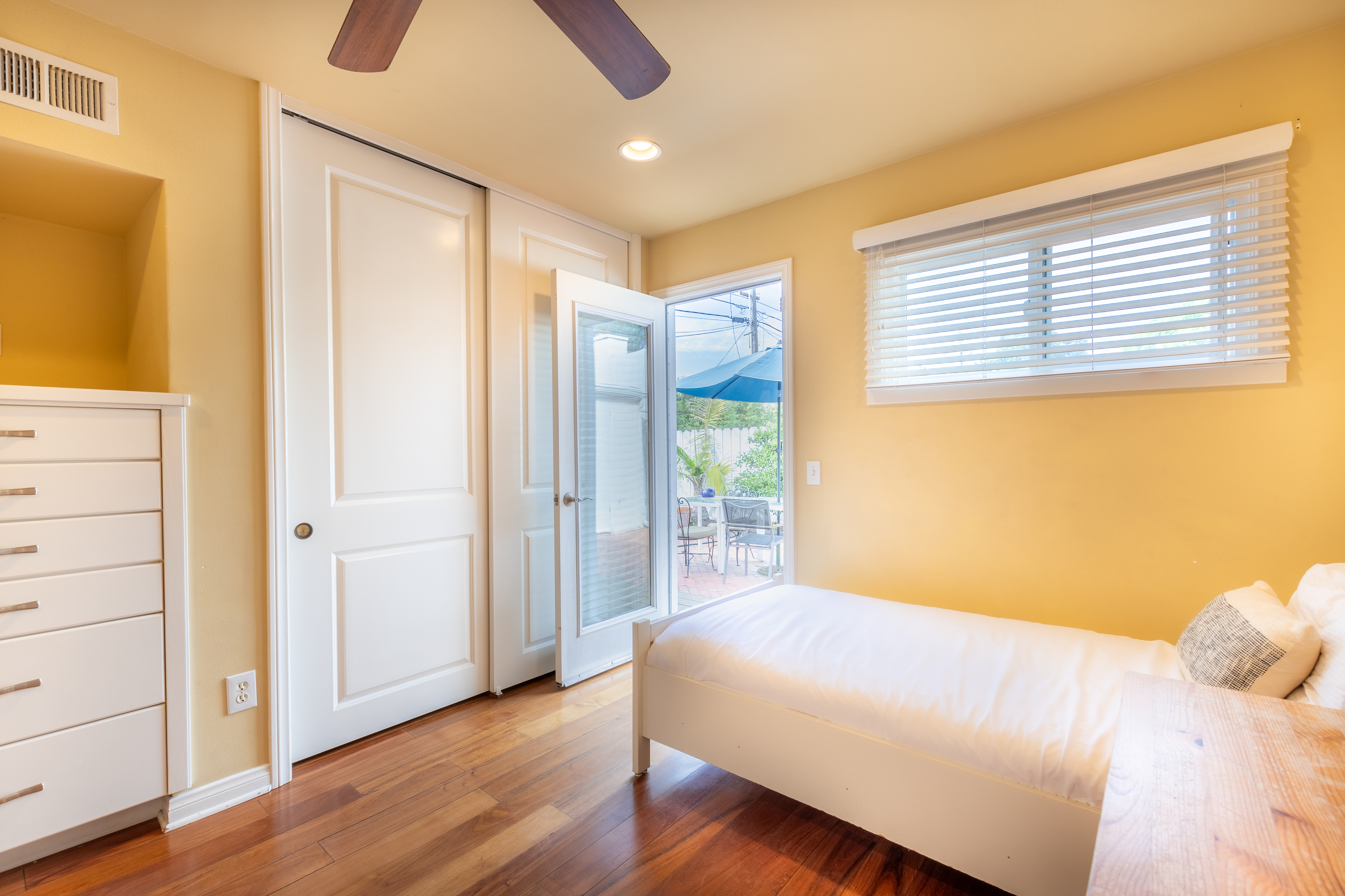 Once you arrive at Sand Patch you will feel like you are somewhere different and begin to relax and enjoy yourself. Enjoy breakfast under a wide market umbrella on your front deck and take in the peek views of La Jolla Cove. Then, after a day out or at the beach retire to the back patio to barbeque, read and dine alfresco. Outdoor lighting will enhance the mood. The property is fully fenced and gated offering privacy. You are in a small, private haven once you close the gate behind you. An outdoor hot and cold shower offers a refreshing alternative for cleaning-up after a quick dip in the ocean. This is a great place to take in the good, year-round weather of La Jolla. Open your French doors and take in the fresh air and warm sunshine.
