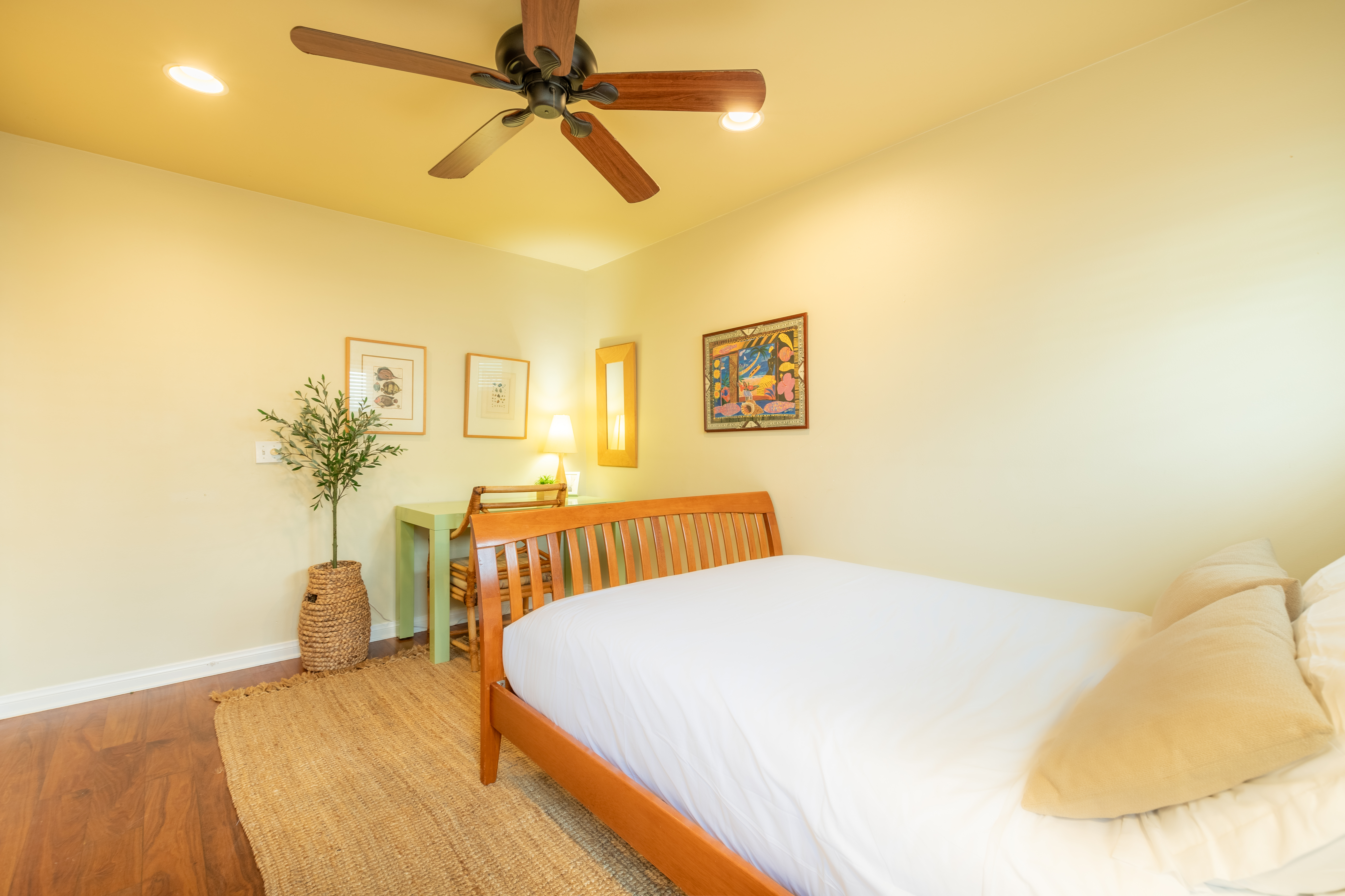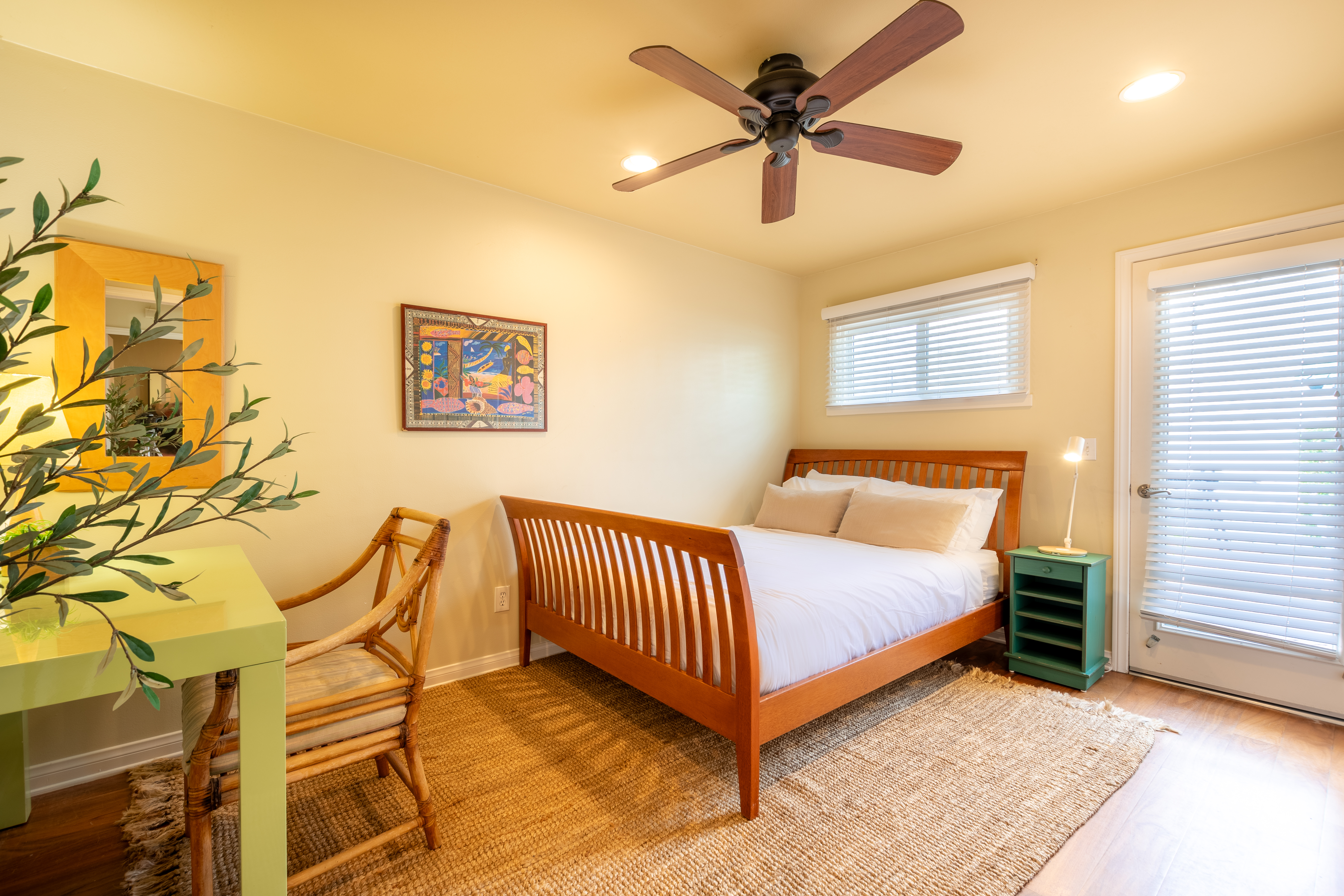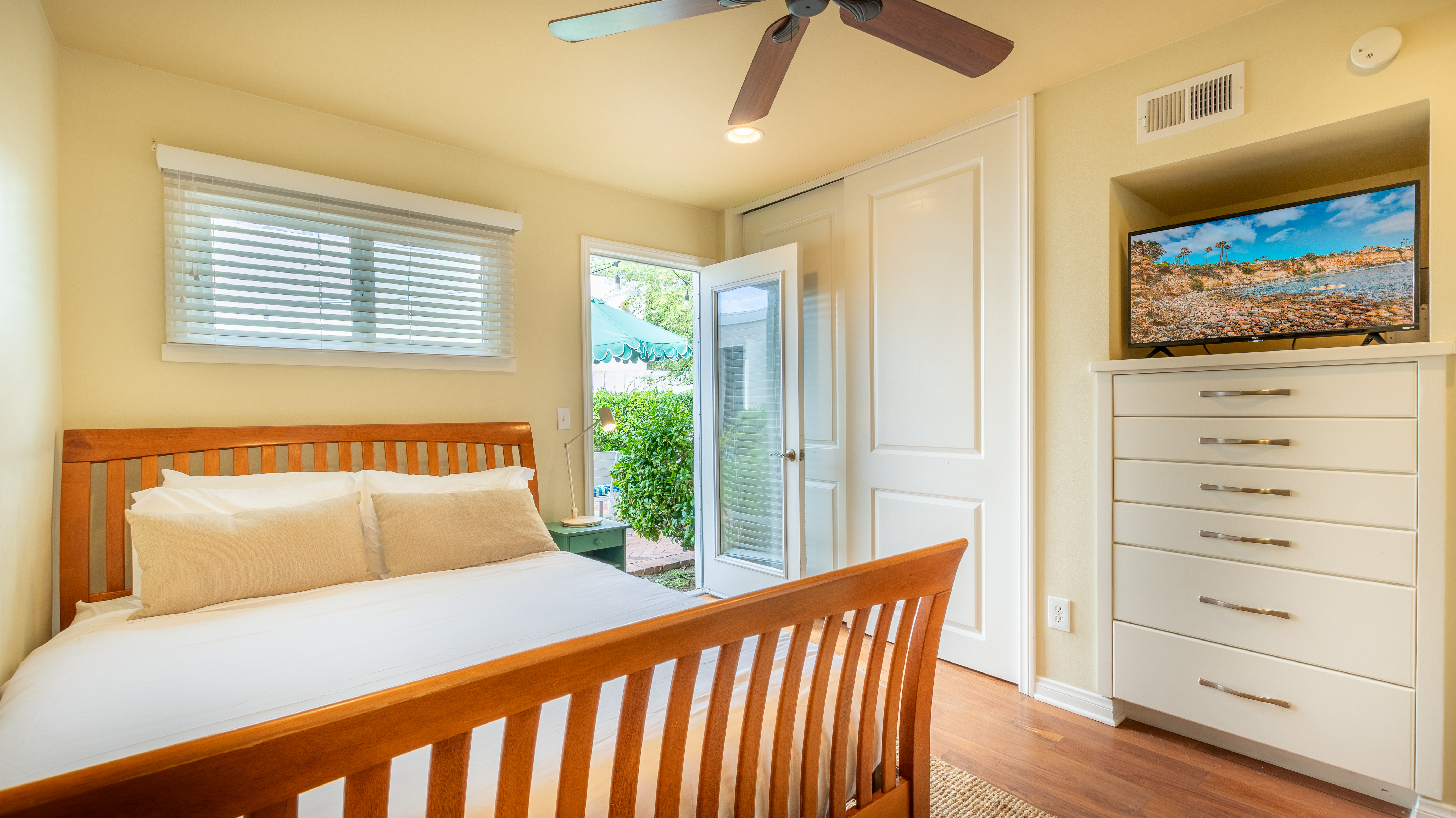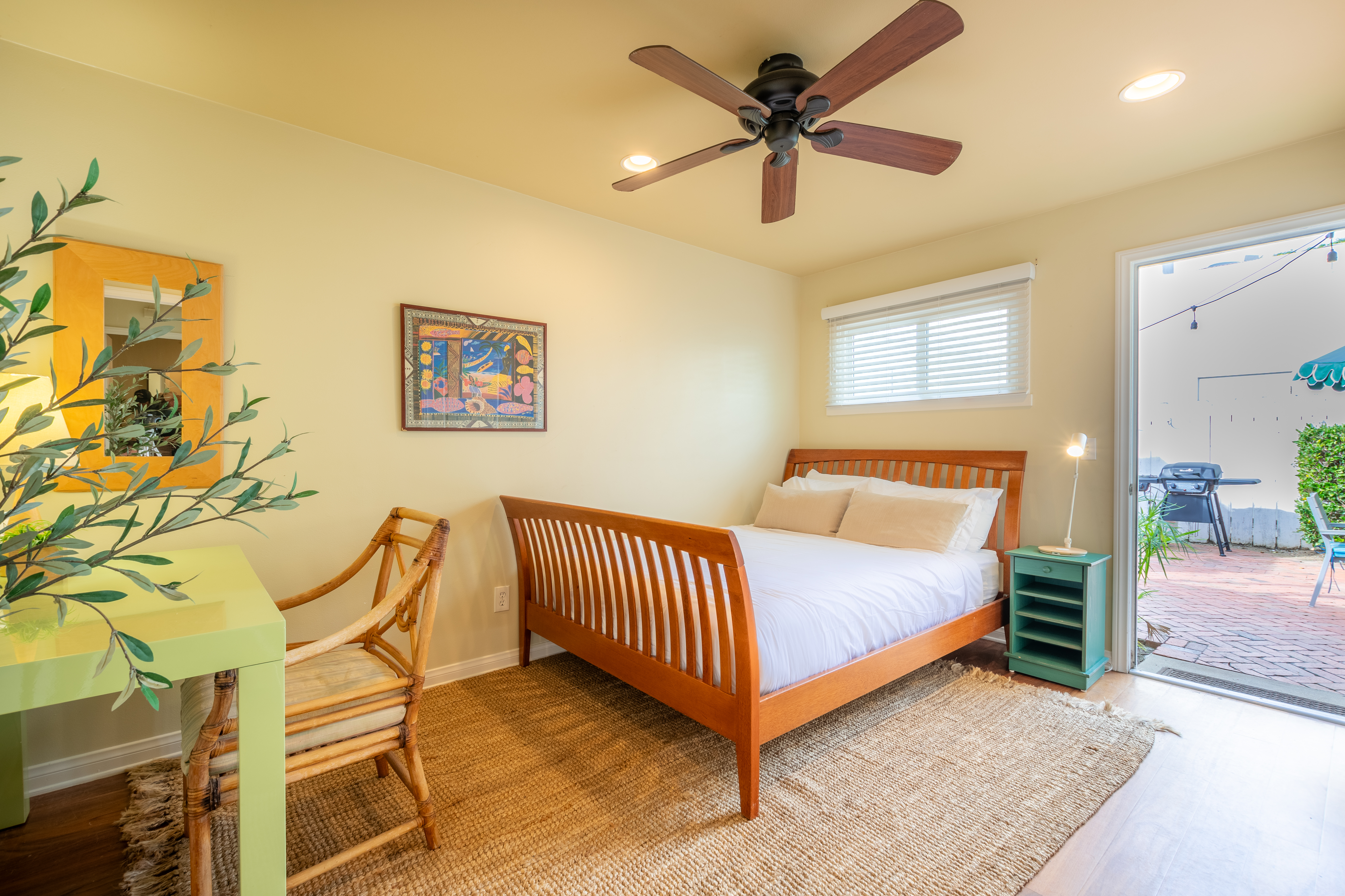 The Second Bedroom features a queen bed with nightstand and reading lamp. A large closet and full-sized dresser provide ample storage space, while large windows and a ceiling fan keep this space bright. This room also features direct access to the back patio.