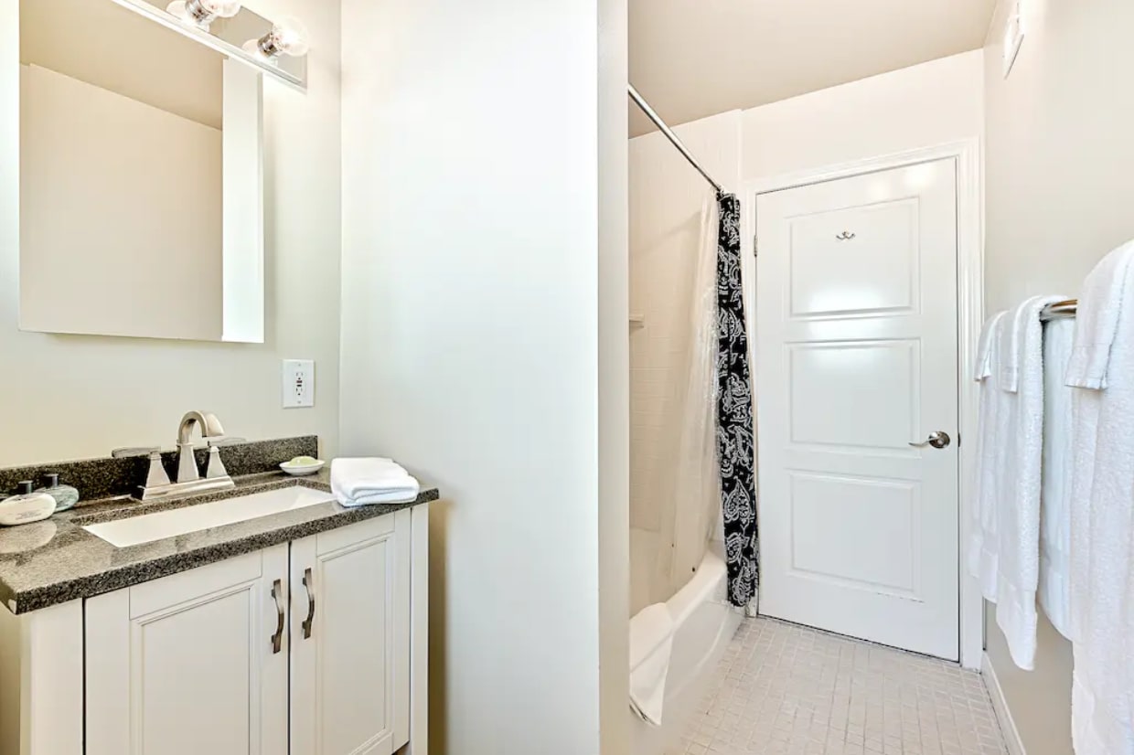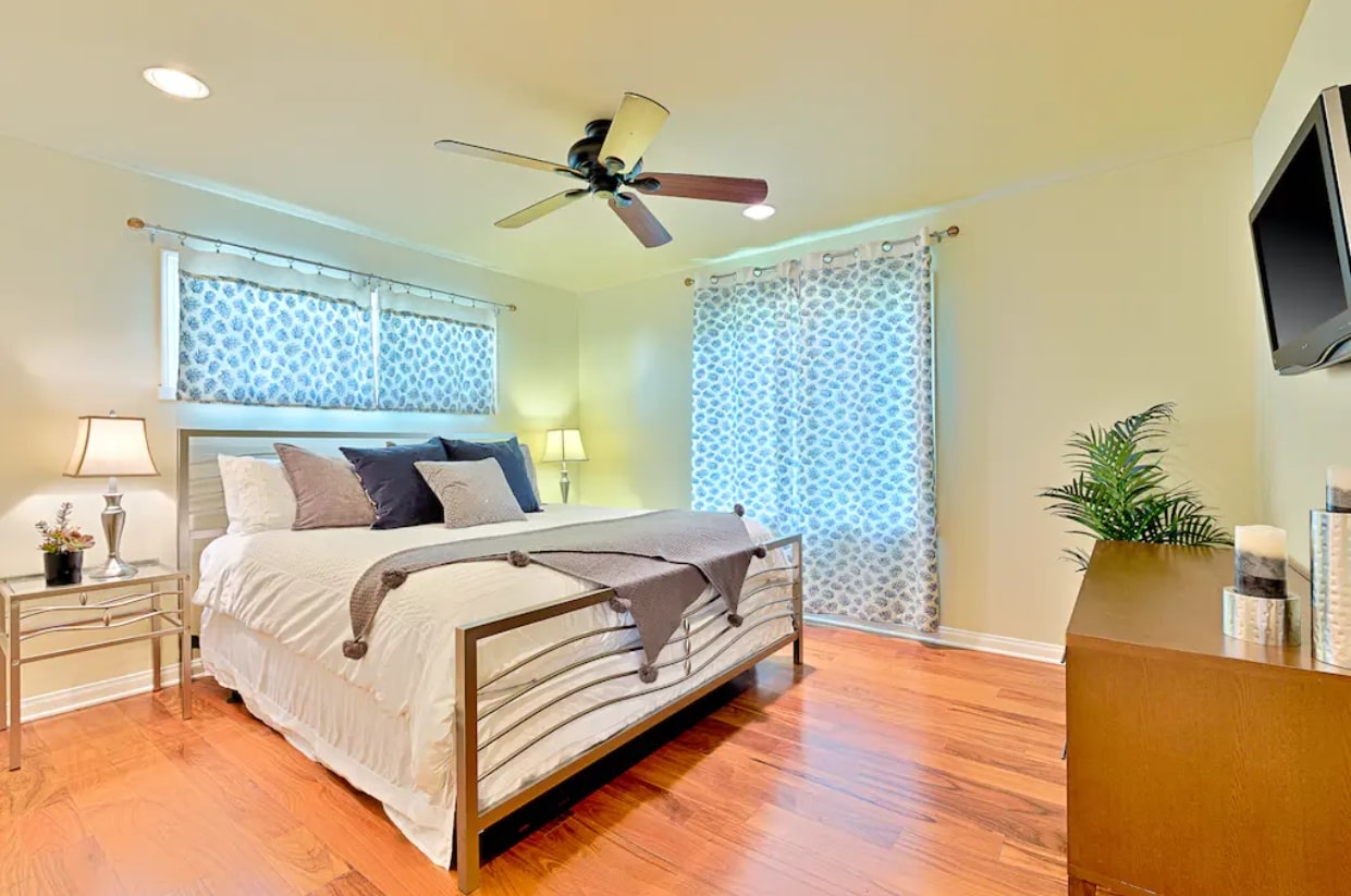 The First Bedroom features a queen bed, fitted and matching bedside tables with lamps and an alarm clock, surrounded by large windows boasting luscious views of the yard. Across from the bed is a full-sized dresser and a TV with full cable. The bathroom, conveniently located off the hall between the two bedrooms, features a modern sink fixture with a mirror and a Shower and Tub.