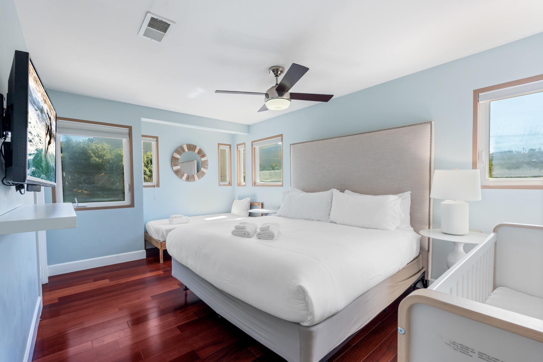The second-floor features three bedrooms. The primary ensuite has a king bed, TV and small balcony. The second upstairs room has a king, and the third bedroom has a king and a single bed along with a crib if needed. Both guest bedrooms are en-suite.
