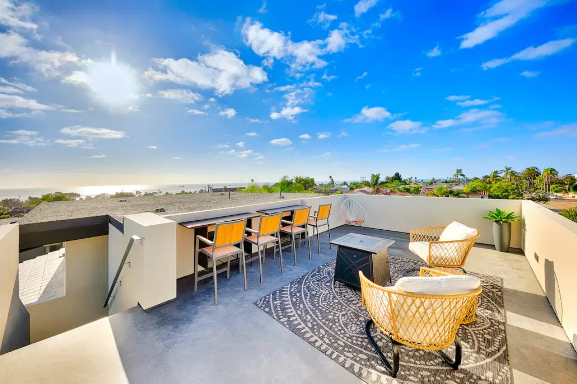Finally, this home has a large rooftop deck with panoramic ocean views to soak in the sunset and put the cherry on top of your vacation. Breakfast bar seating and a fire pit in front of a love seat make this rooftop deck the place to be.