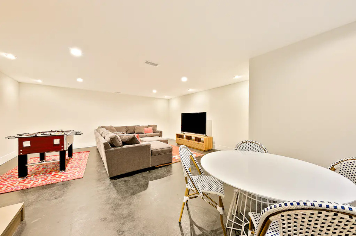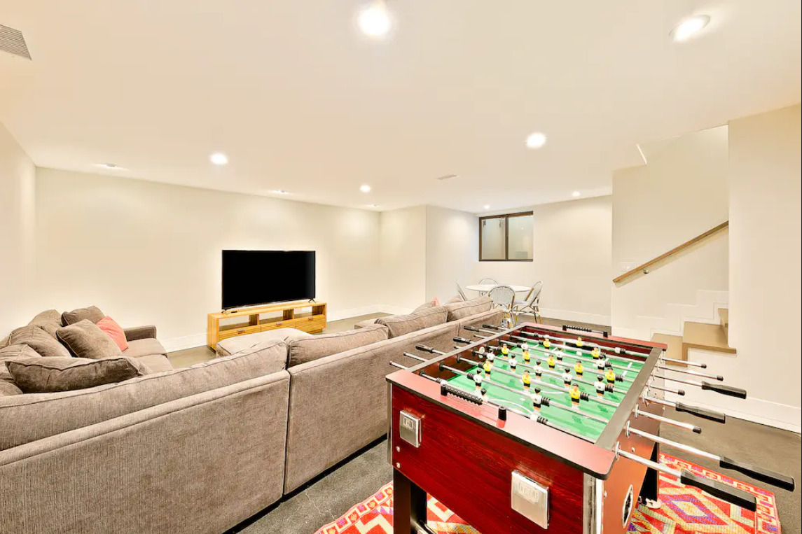 On the first floor, you will find a family room with a large TV, and fireplace, as well as an adjacent bathroom including a large walk in shower. You will also find the laundry room and first guest bedroom with a King bed on this entry floor. Stairs led down to a basement TV/game room area with a foosball table, TV, and plenty of seating accommodations.